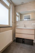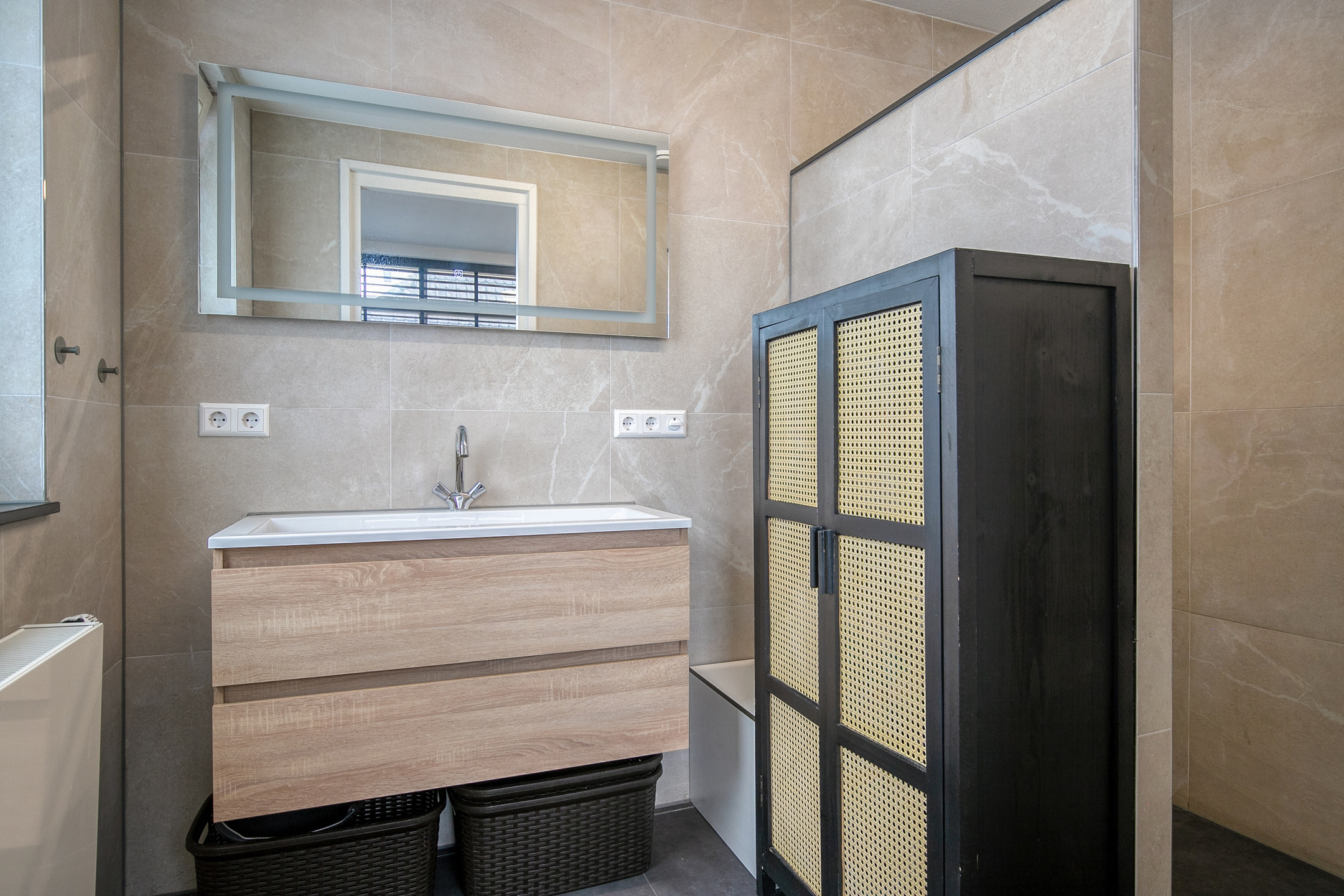 De badkamer is modern en volledig betegeld, uitgerust met een wastafel in meubel, inloopdouche met regendouche en een radiator.
