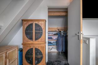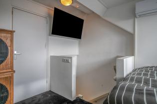 On the second floor, you'll find the bedroom, featuring a dormer window at the rear, built-in wardrobe space, and air conditioning (2022). The room is warmly finished and includes recessed lighting and tilt-and-turn windows. Adjacent is a storage room (used as wardrobe space) with the central heating system (Nefit, 2015) and mechanical ventilation. Electric shutters are also present here.