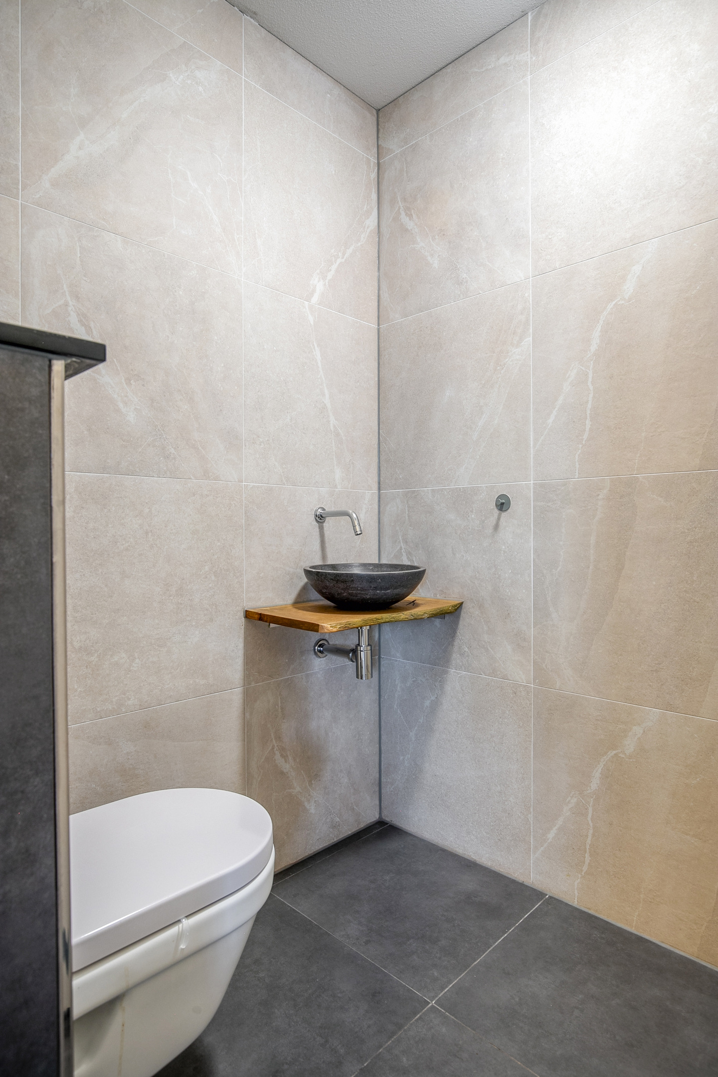 Het volledig betegelde, moderne toilet is erg ruim en is voorzien van een zwevend closet, fonteintje en vloerverwarming.