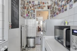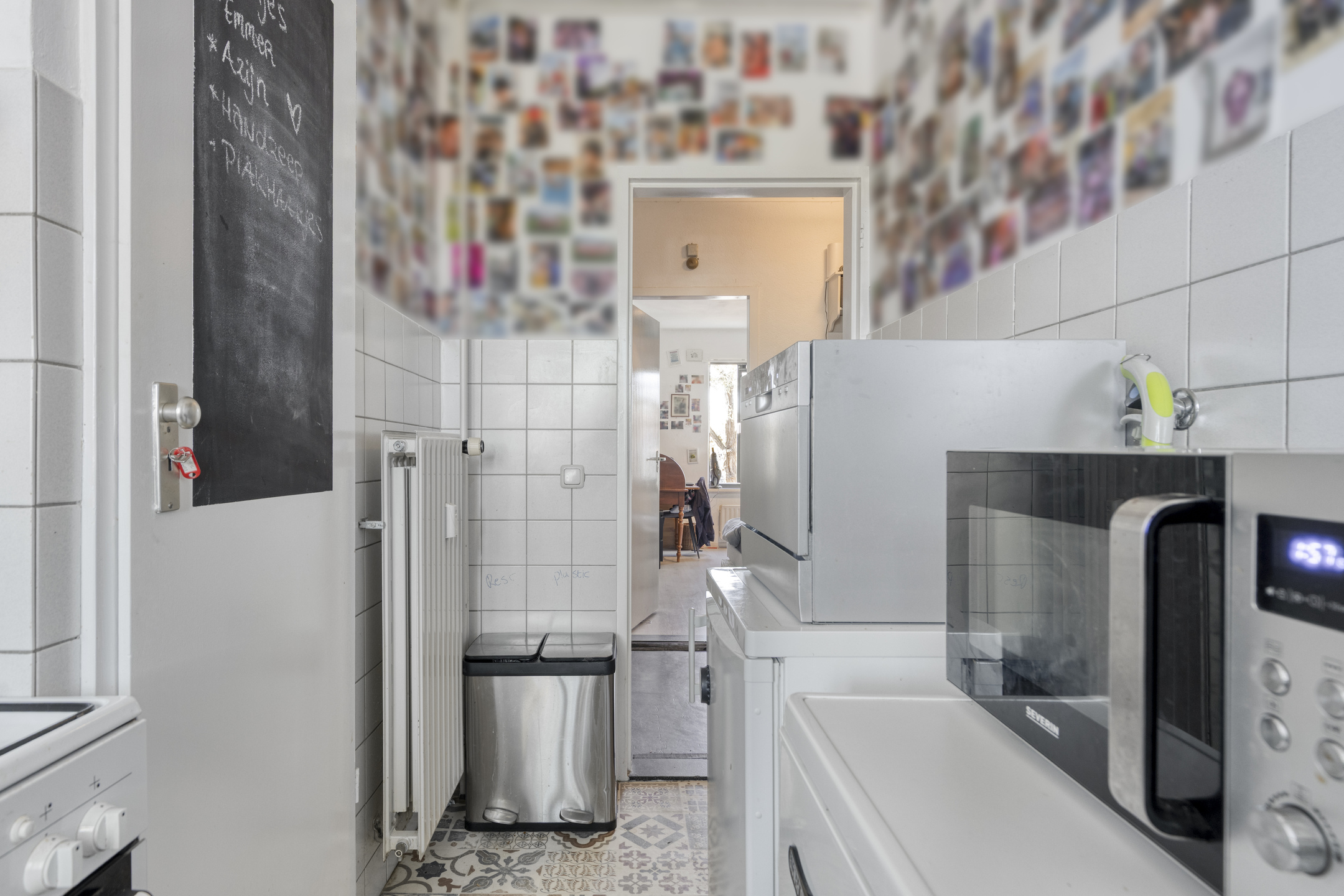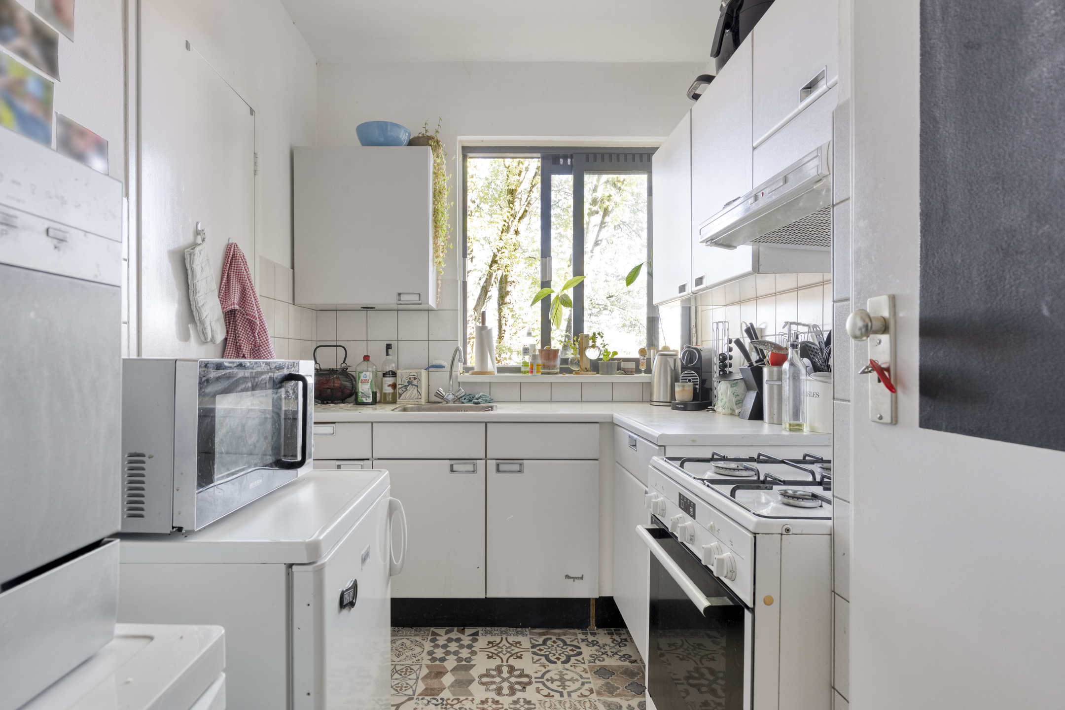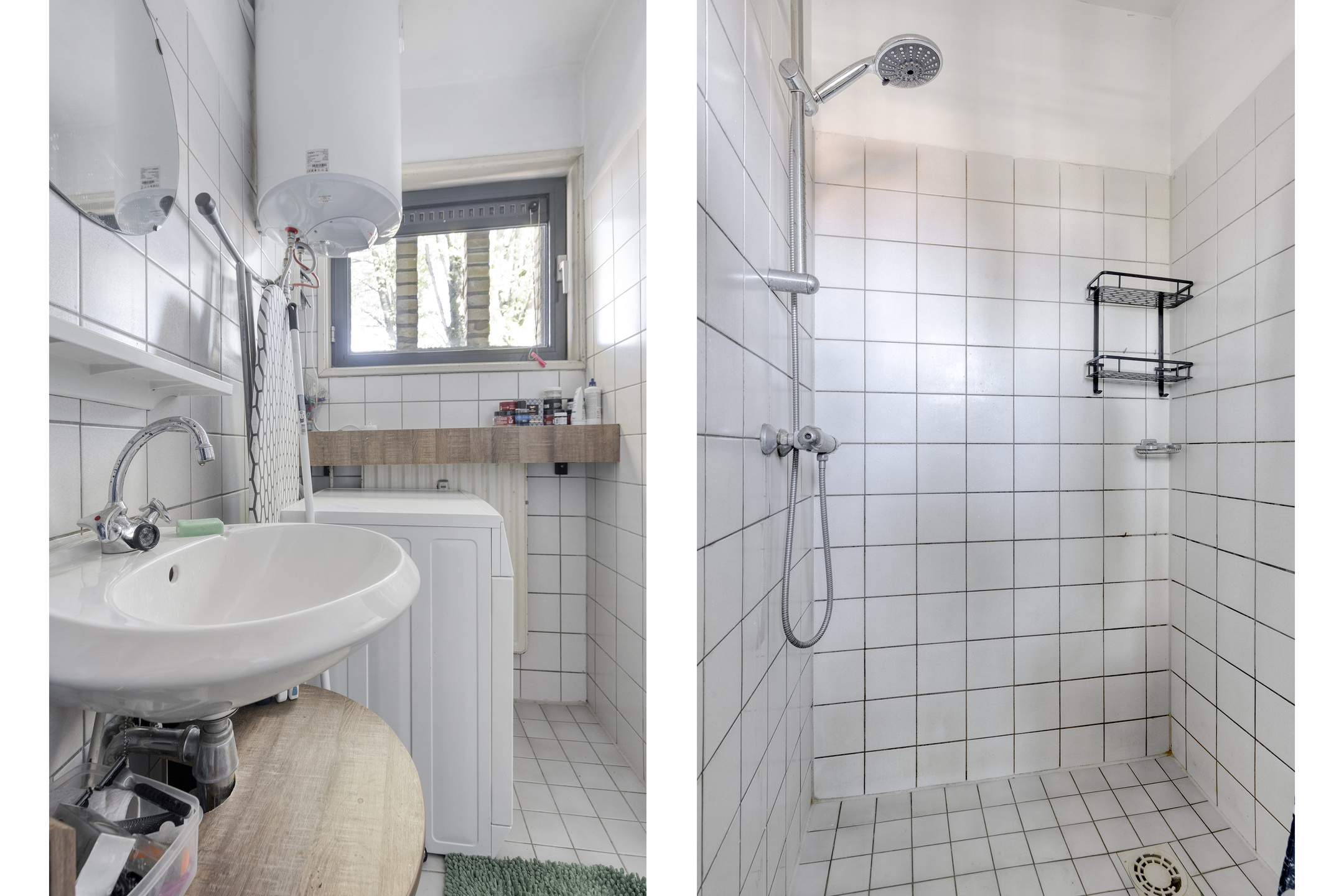 De keuken is netjes en praktisch ingericht in een hoekopstelling en beschikt over een spoelbak, afzuigkap en de aansluiting voor wasapparatuur. Vanuit de keuken is ook de badkamer bereikbaar, voorzien van een wastafel, douche met thermostaatkraan en de boiler. Ook hier zijn aansluitingen voor de wasapparatuur beschikbaar.