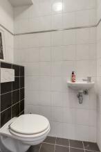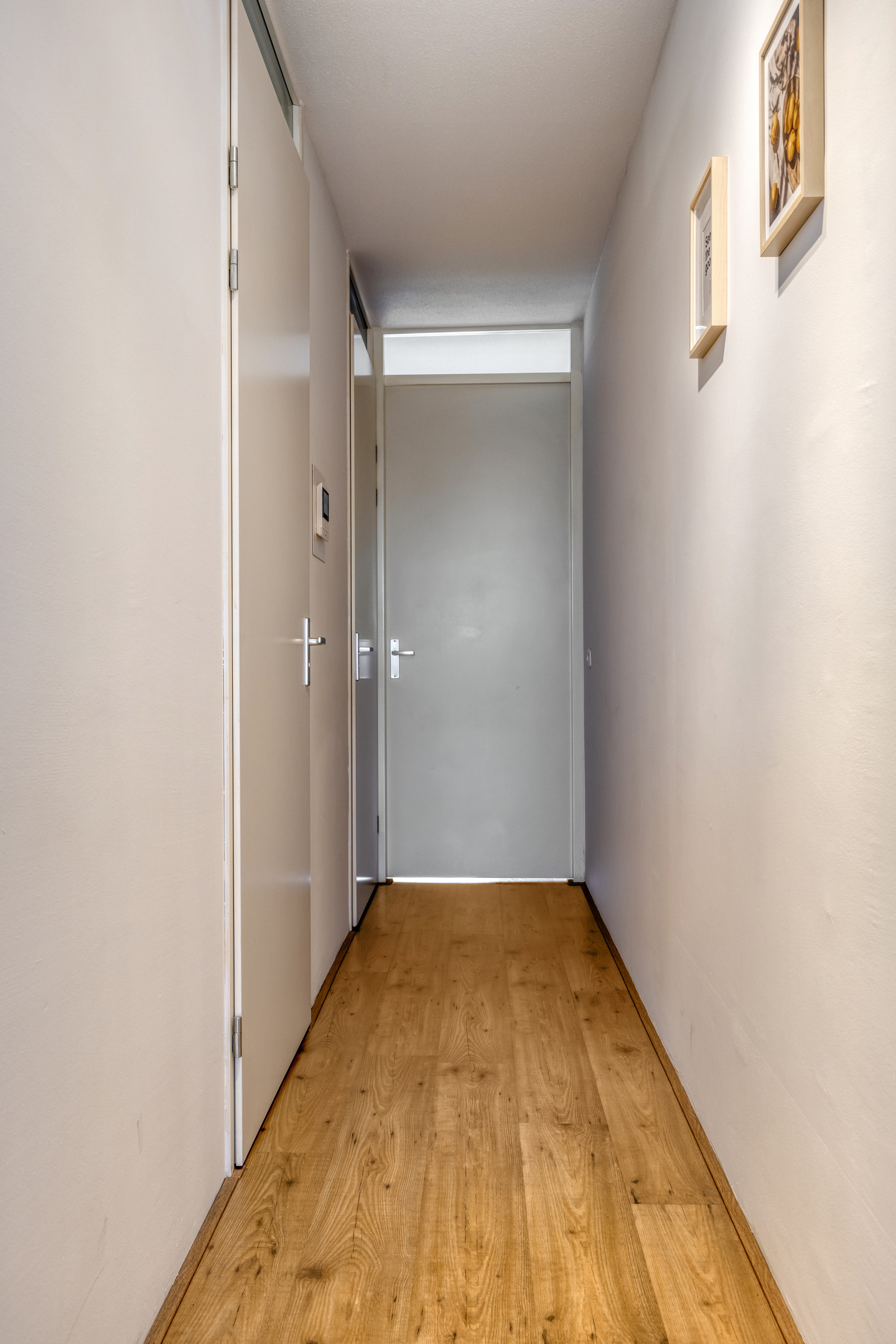 De galerij aan de achterzijde biedt toegang tot de hal van het appartement. Deze hal is voorzien van de uitgebreide meterkast, de moderne toiletruimte met fonteintje en biedt toegang tot diverse vertrekken.