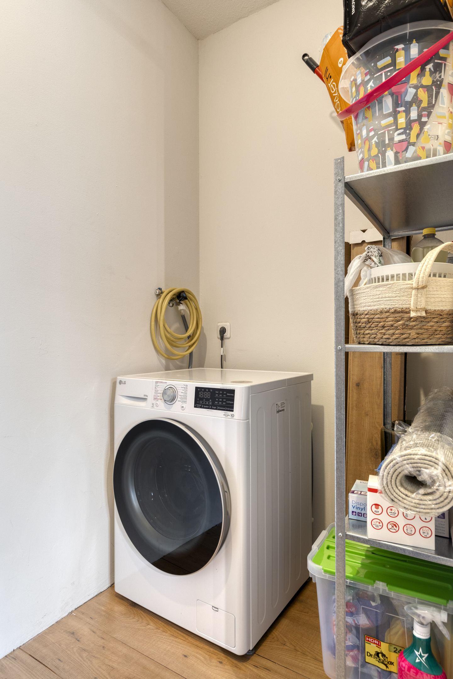 De woonkamer biedt toegang tot een praktische berging/technische ruimte. Deze ruimte biedt veel extra bergruimte en is voorzien van een nieuwe cv-ketel (2025), de unit voor mechanische ventilatie en de aansluitingen voor wasapparatuur.