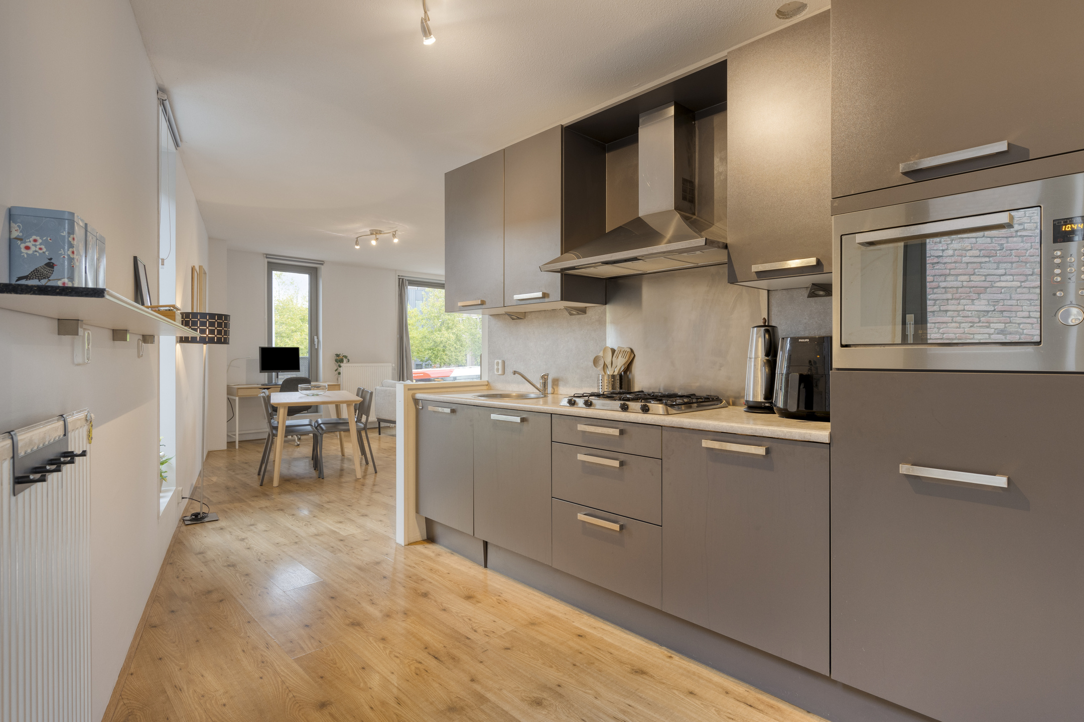 Naast de berging bereikt u via een open doorgang de moderne keuken. Deze nette keuken is uitgevoerd in een matte grijze rechte opstelling en voorzien van alle nodige inbouwapparatuur, te weten: een 4-pitsgaskookplaat met afzuigkap, een koelkast, een oven en een vaatwasser. Door de gunstige hoekligging van het appartement beschikt de keuken over een Frans balkon met draai-/kiepmogelijkheid.