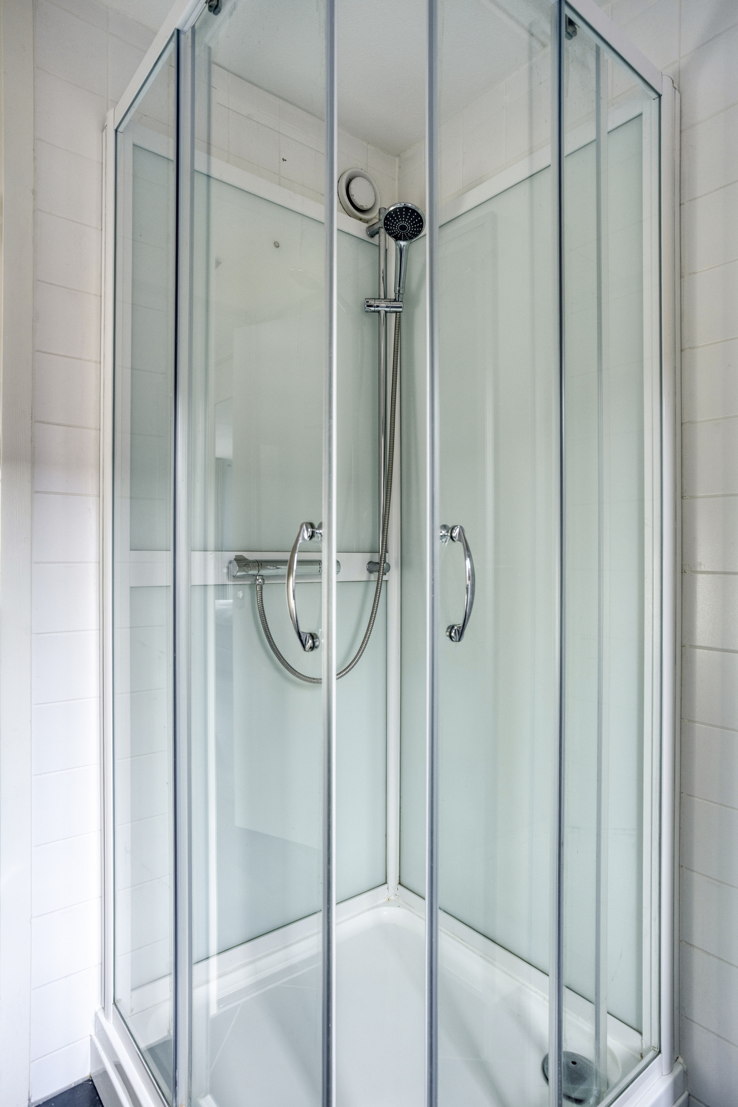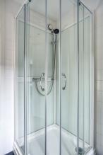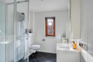 De badkamer is volledig betegeld, ruim en licht en voorzien van een douchecabine, wastafel in meubel en zwevend closet.