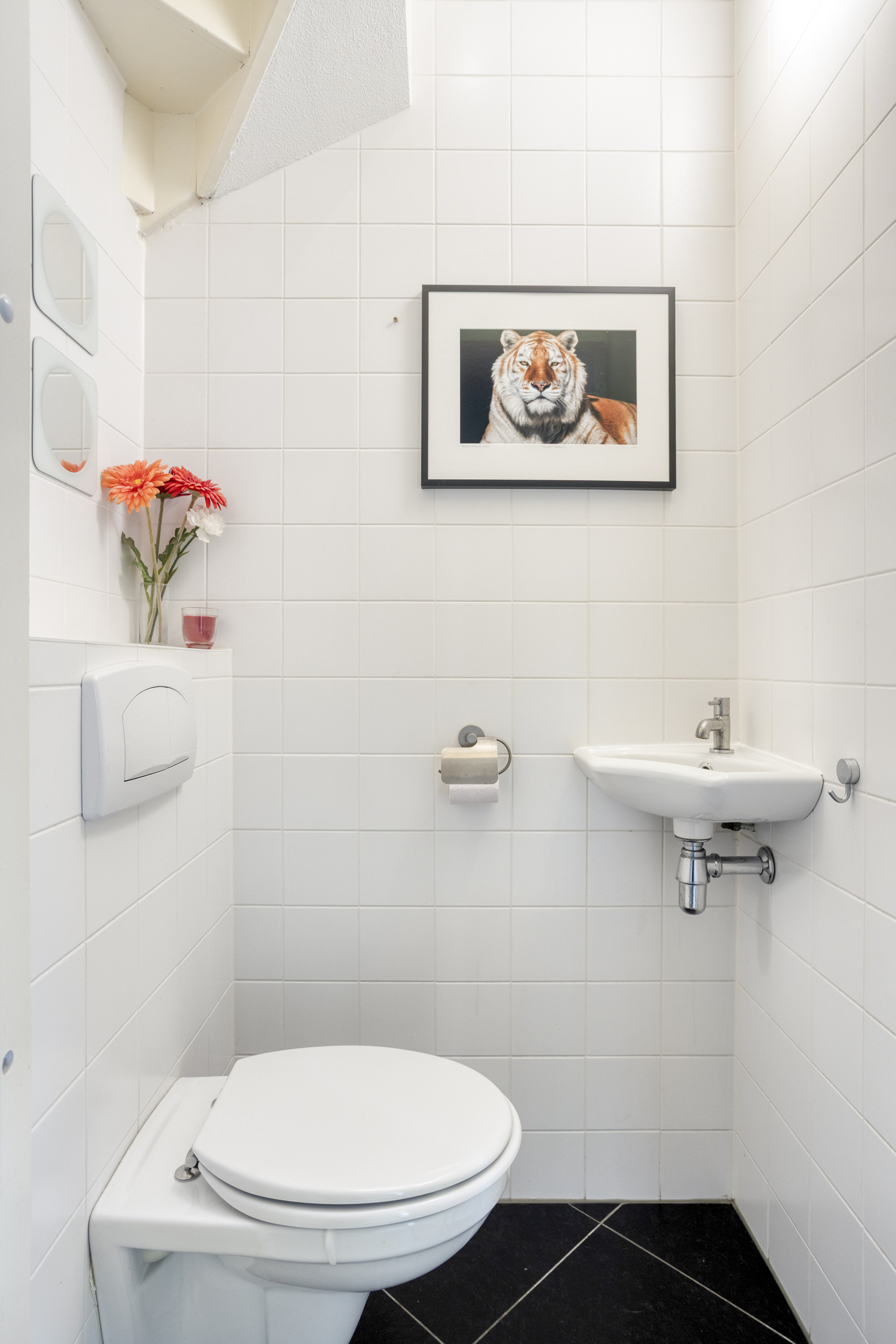 Het toilet is volledig betegeld, voorzien van een modern zwevend closet en fonteintje.