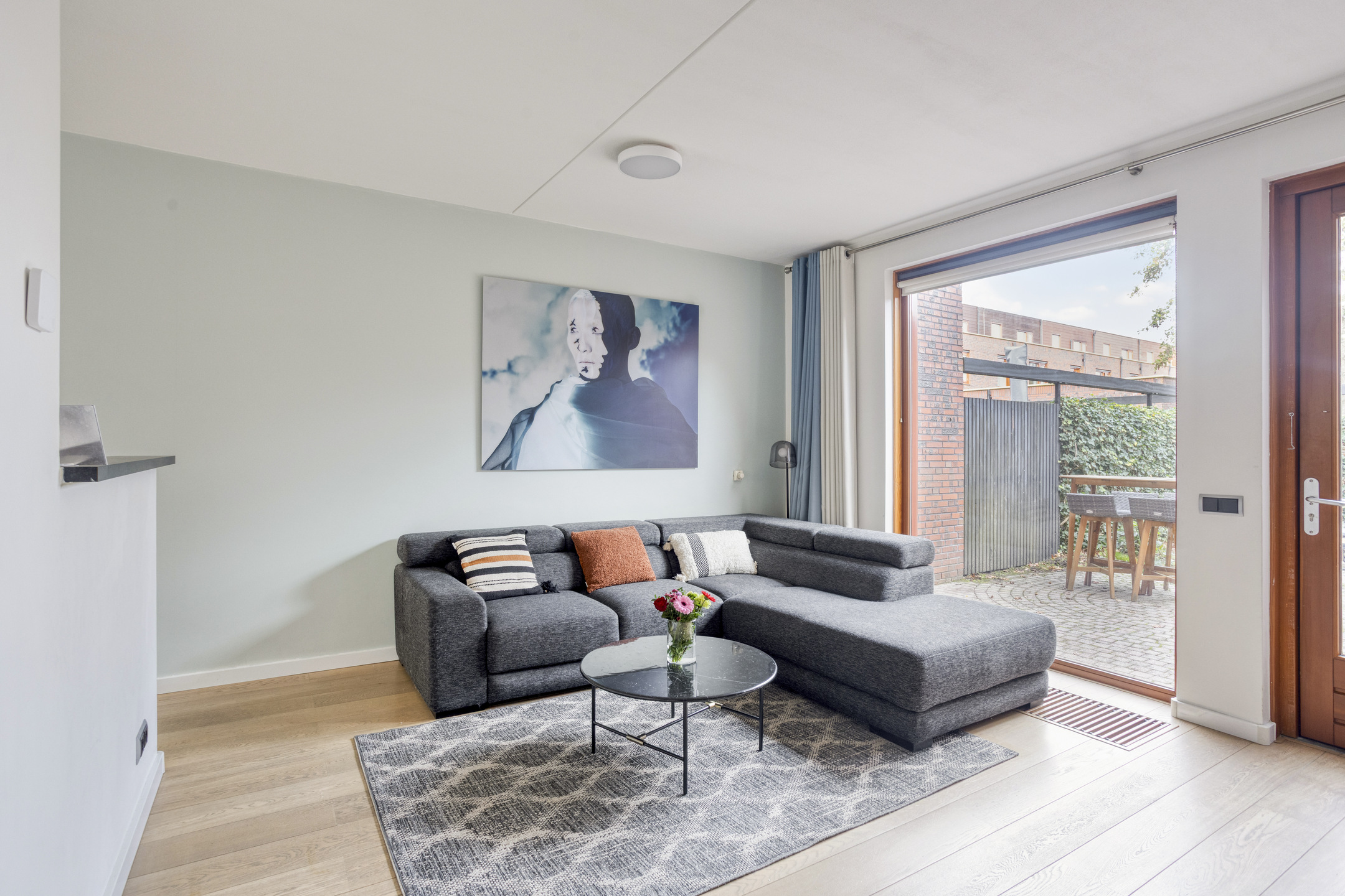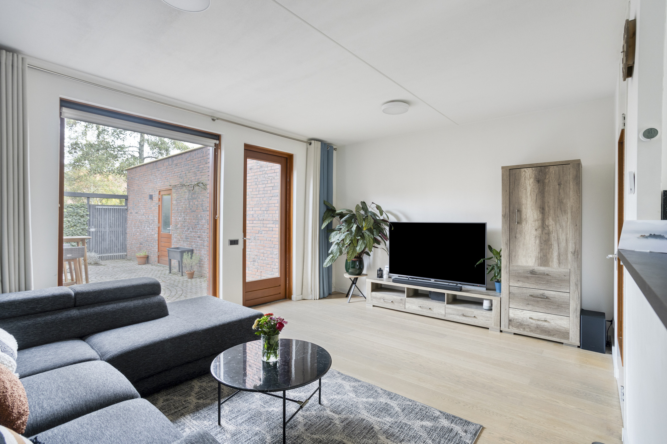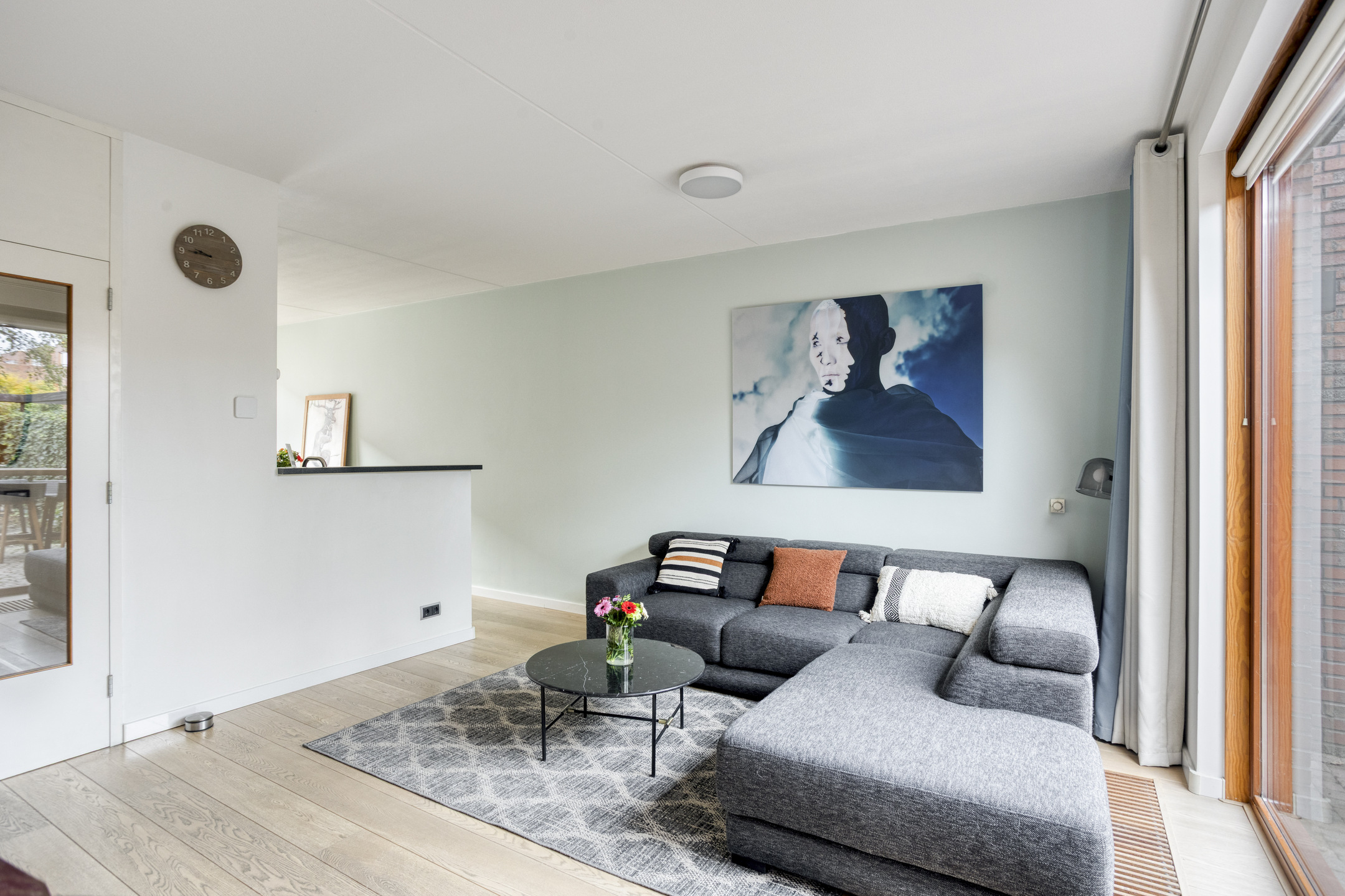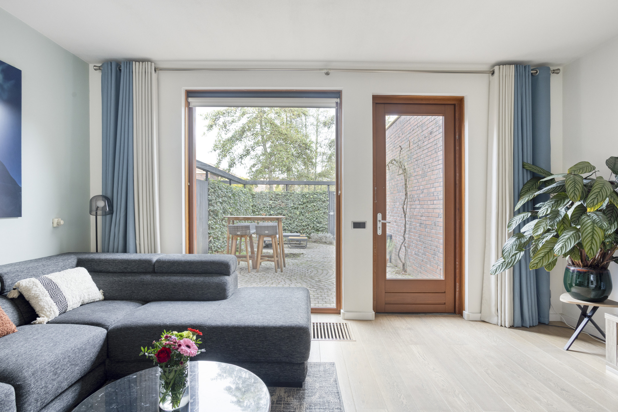 Aan de tuinzijde ligt de heerlijk lichte woonkamer dankzij de grote en hoge ramen. De parketvloer en strak afgewerkte wanden zorgen voor een warme en moderne uitstraling. Via de achterdeur loop je direct de tuin in.