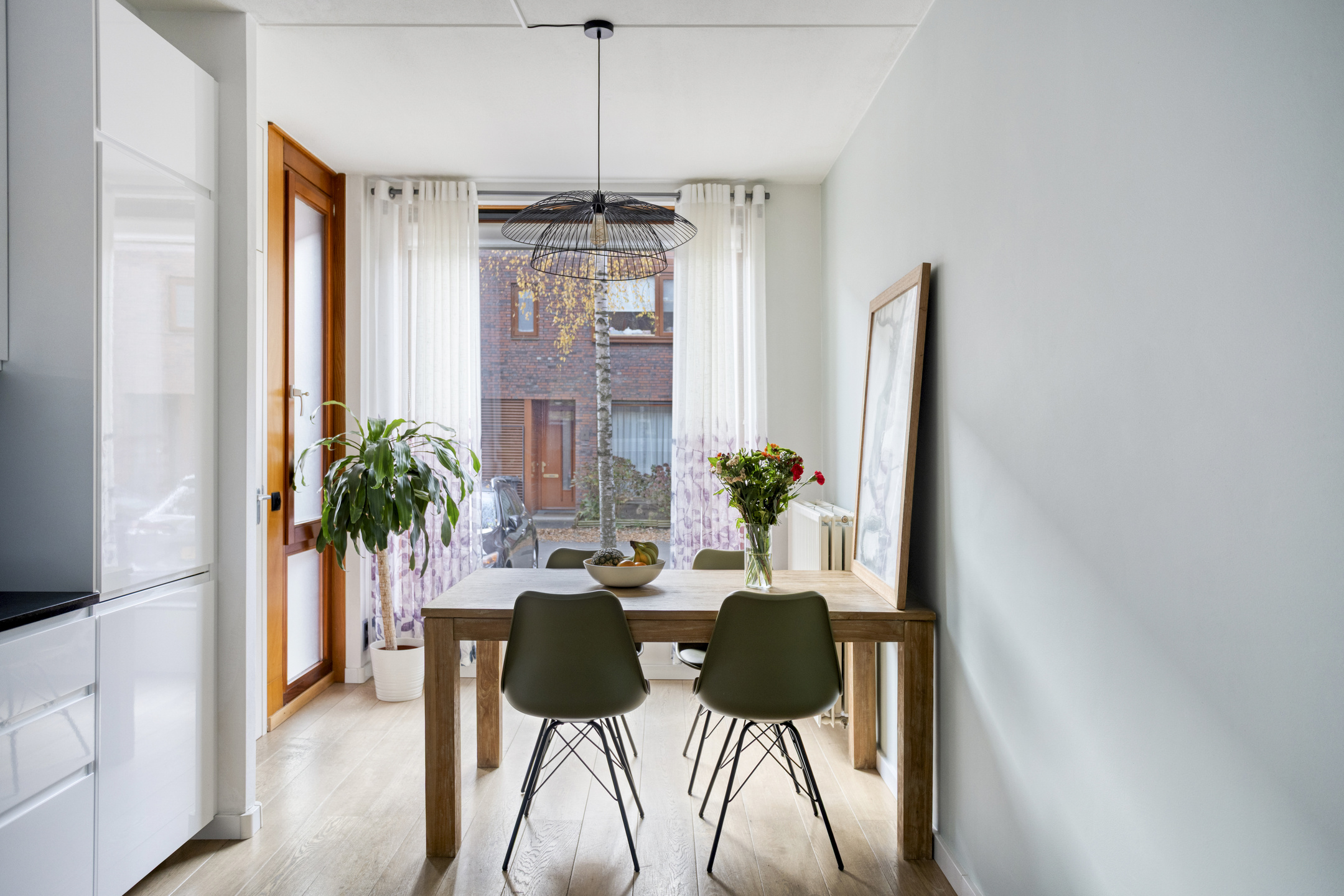 Aan de voorzijde is alle ruimte voor een royale eethoek met uitzicht op de rustige straat.