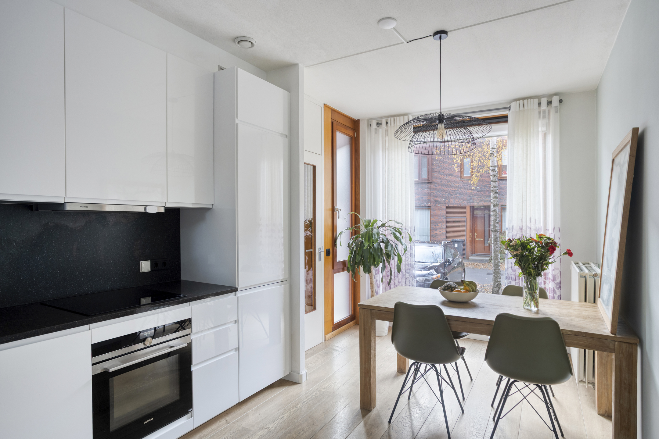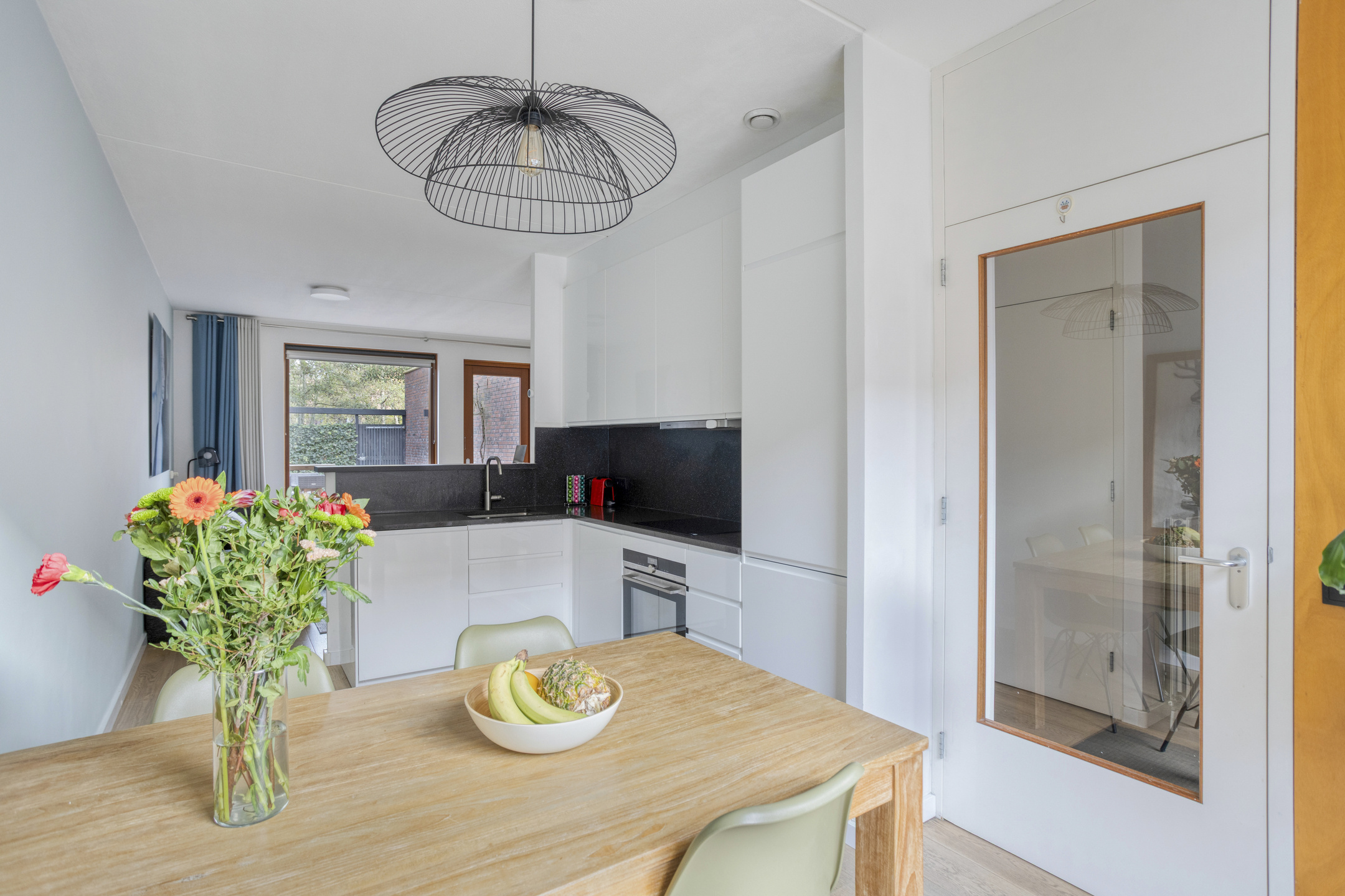 At the front of the house is the renewed (2024) semi-open white kitchen. It is equipped with, among other things, a fridge-freezer, induction cooktop, extractor hood, dishwasher, and ample storage space.