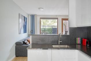 Aan de voorzijde bevindt zich de vernieuwde (2024) half-open, witte keuken. De keuken is voorzien van onder andere een koel-vriescombinatie, inductiekookplaat, afzuigkap, vaatwasser en veel bergruimte.