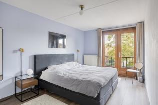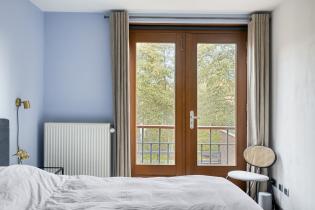 Slaapkamer 1 (ca. 15m2) is gelegen aan de achterzijde. De ruime slaapkamer is voorzien van een laminaatvloer, strak stucwerk, hardhouten kozijnen met HR++ glas en een charmant Frans balkon.