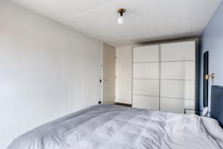 Slaapkamer 2 (ca. 11m2) is gelegen aan de voorzijde en is eveneens ruim en licht, voorzien van een laminaatvloer, strak stucwerk en hardhouten kozijnen. Ideaal als hoofdslaapkamer of kinderkamer.