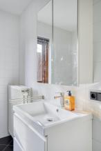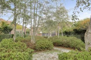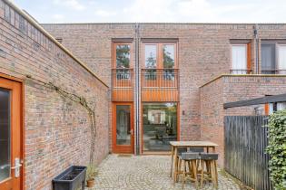 The low-maintenance backyard features attractive paving and green hedges for optimal privacy. There is plenty of room for both a lounge area and an outdoor dining table. At the back of the garden is a brick storage shed, perfect for bicycles and storage. The back entrance leads to the shared courtyard, where you can easily interact with neighbors and where children can play safely and freely.