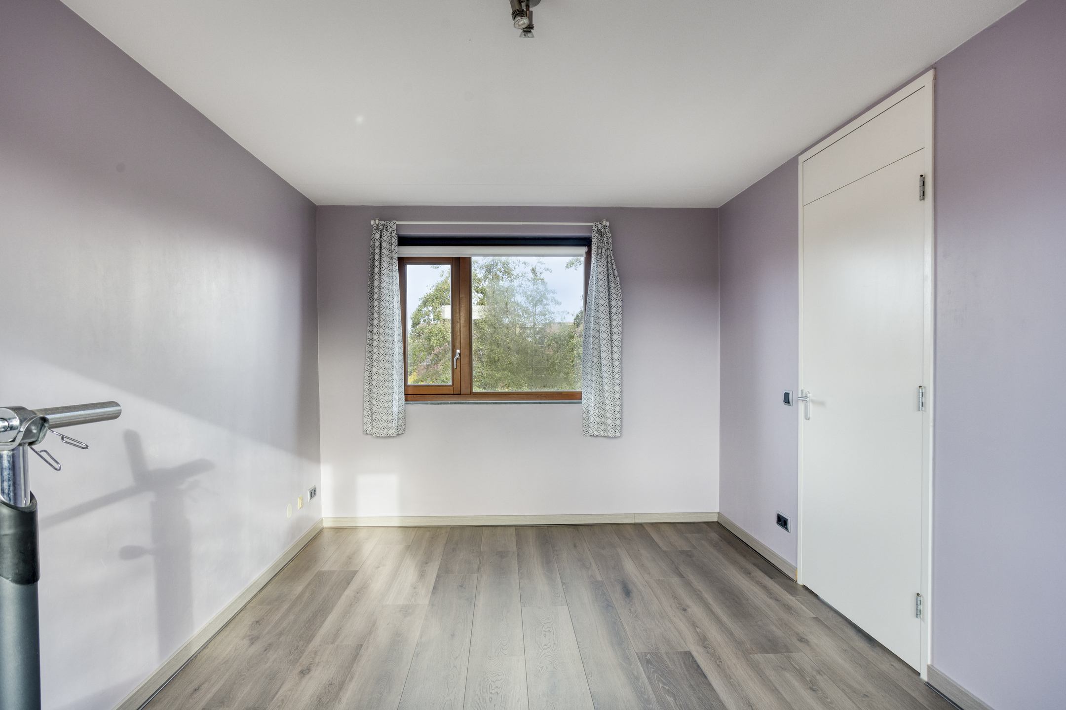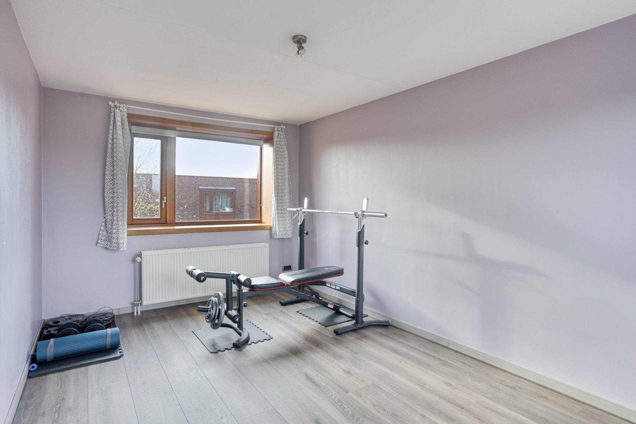 A large, bright attic bedroom with two windows in hardwood frames with HR++ glass and laminate flooring. Very suitable as a master bedroom, office, hobby room, or fitness space.
