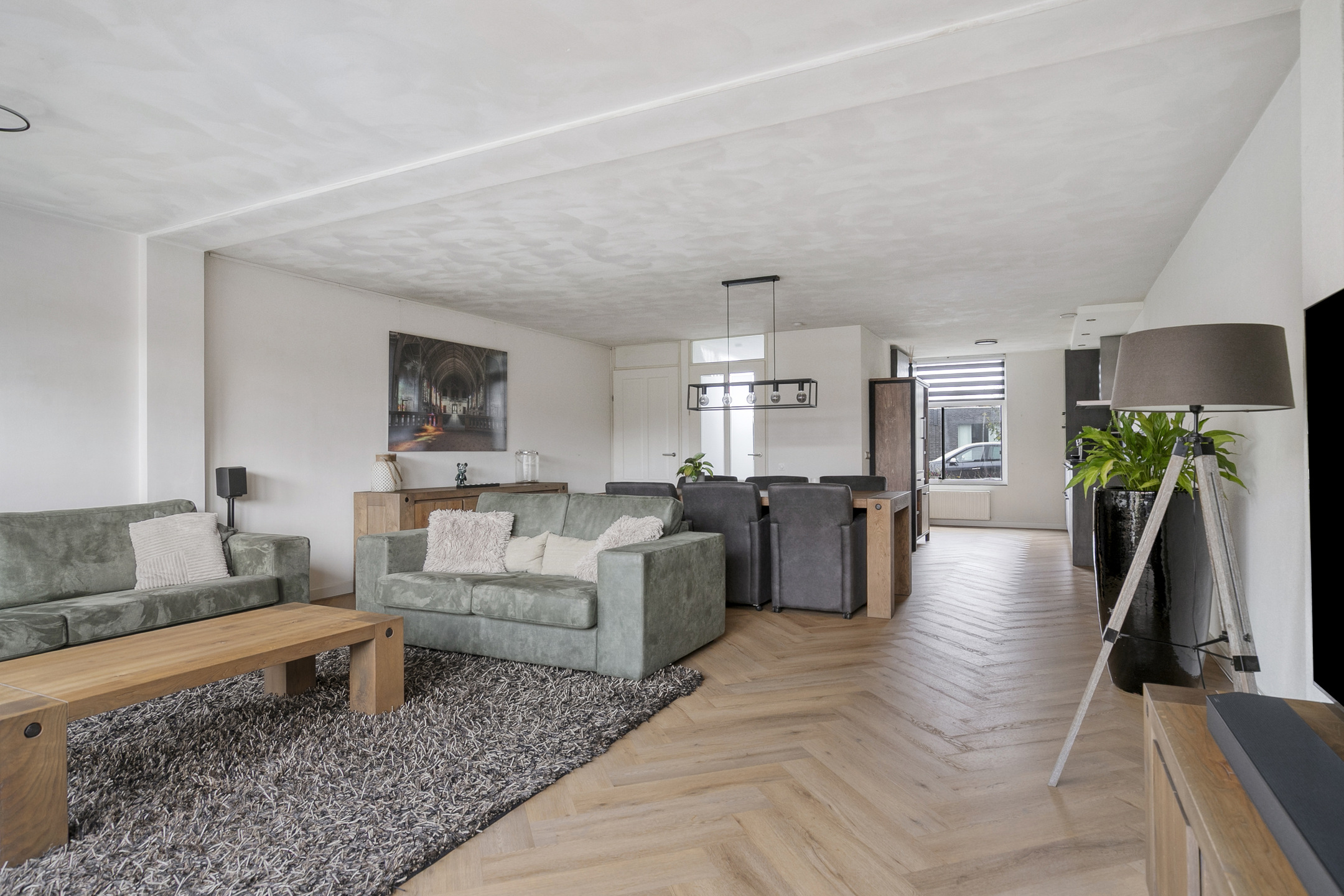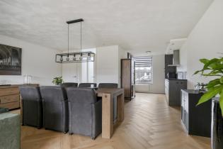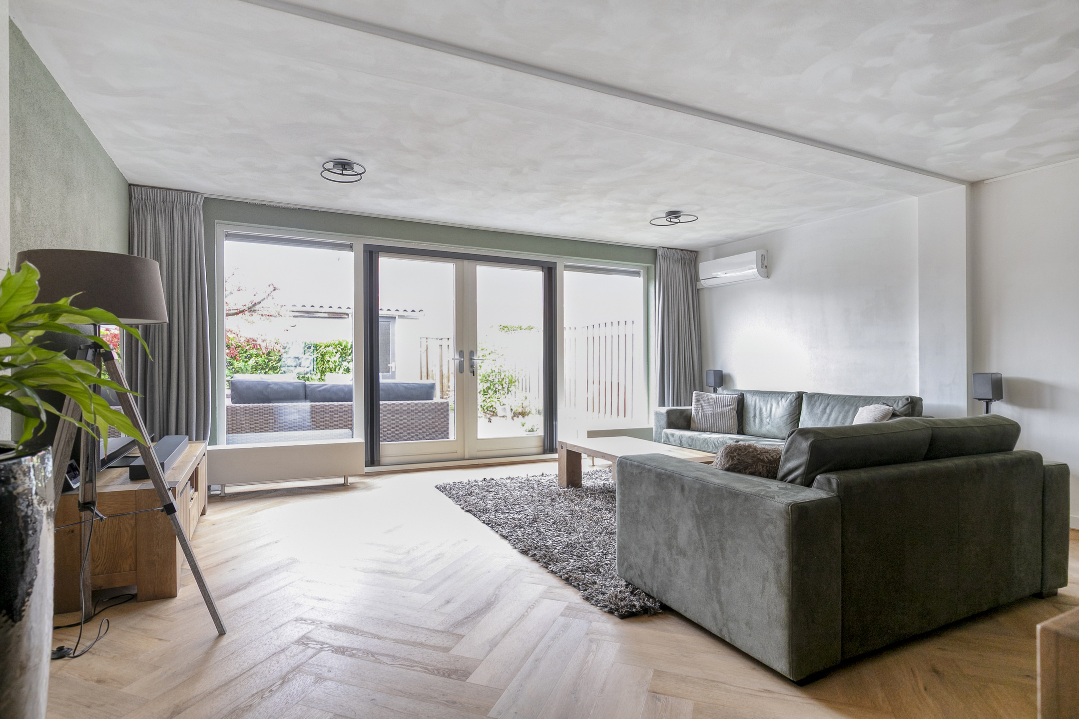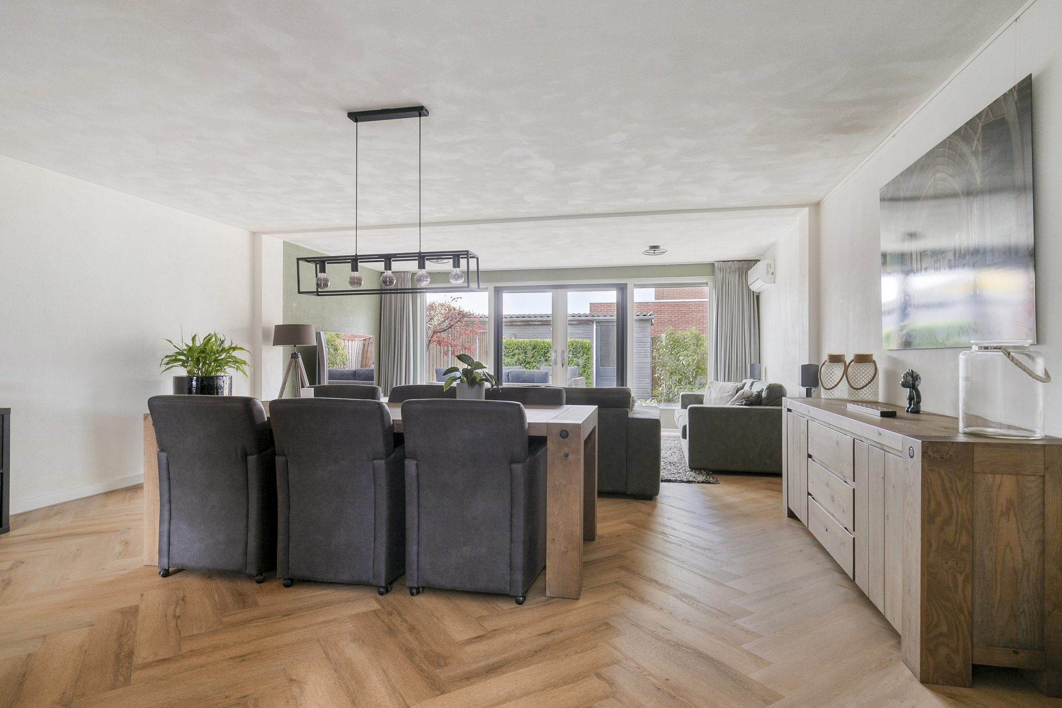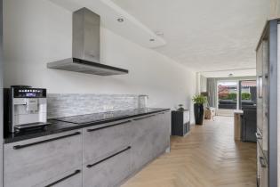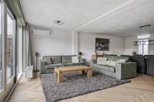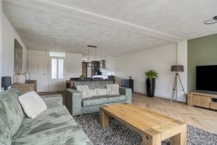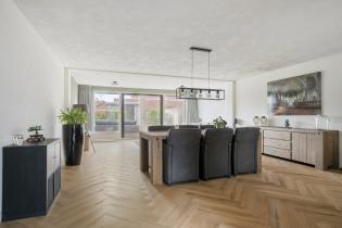 De ruime woonkamer is licht en comfortabel dankzij de brede opzet en de uitbouw aan de achterzijde. Grote raampartijen en openslaande tuindeuren zorgen voor veel natuurlijk licht en een prettig contact met de tuin. De zithoek bevindt zich aan de achterzijde van de woning, met zicht op het groen, en is uitgerust met airconditioning.