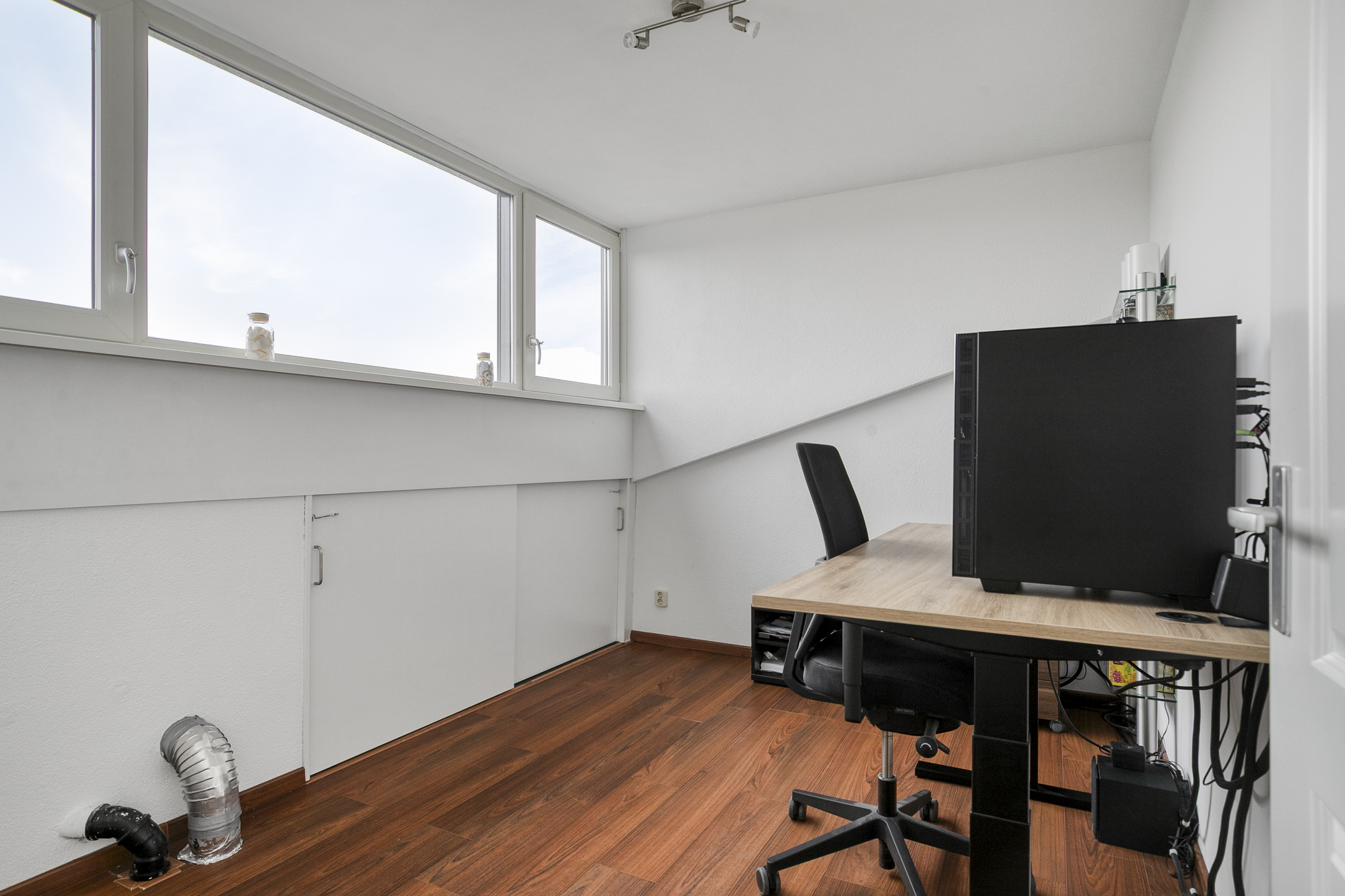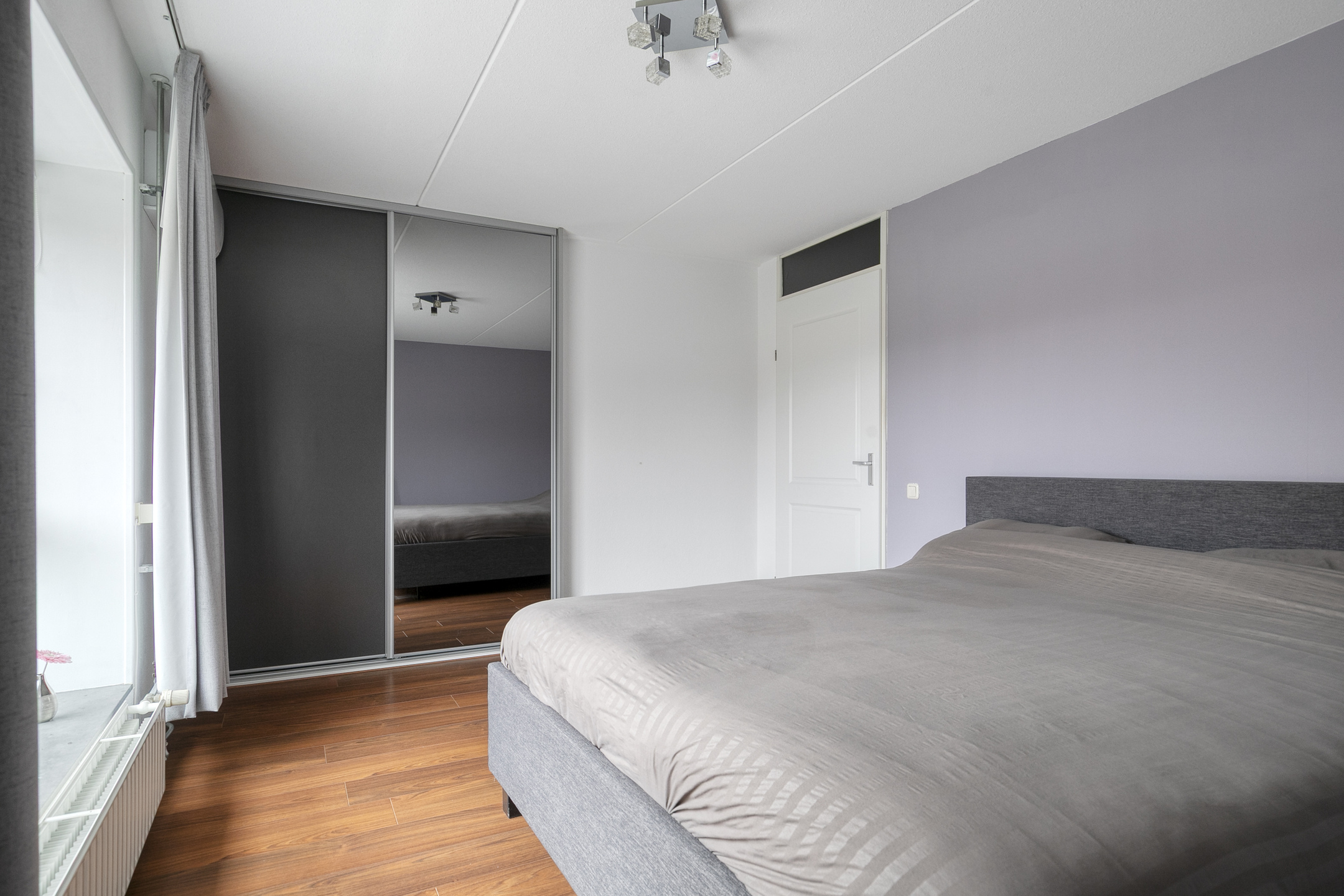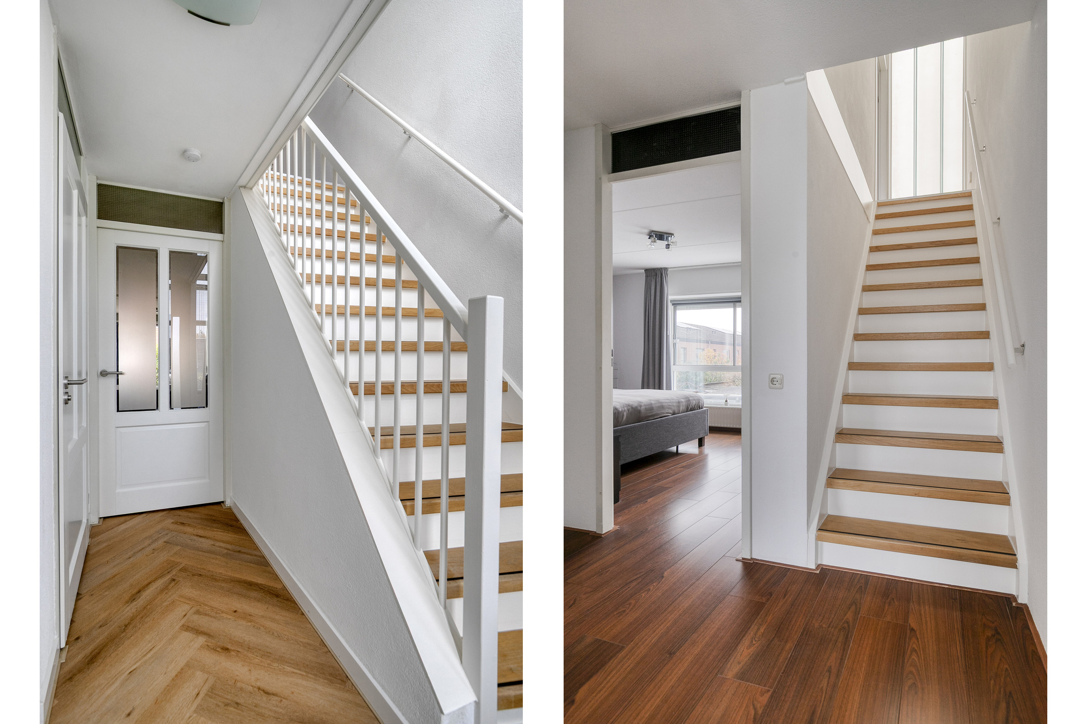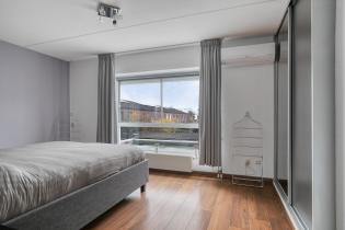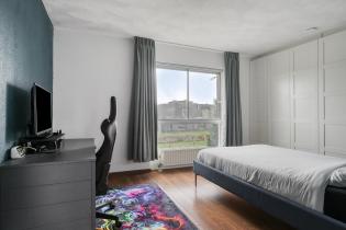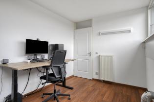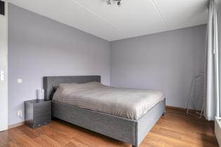 De slaapkamer aan de voorzijde (ca. 14 m²) beschikt over een laminaatvloer, spachtelputz wanden en een elektrisch bedienbaar screen. De hoofdslaapkamer aan de achterzijde is eveneens keurig afgewerkt en voorzien van een rolluik en vaste kast die doorloopt onder de trapopgang.