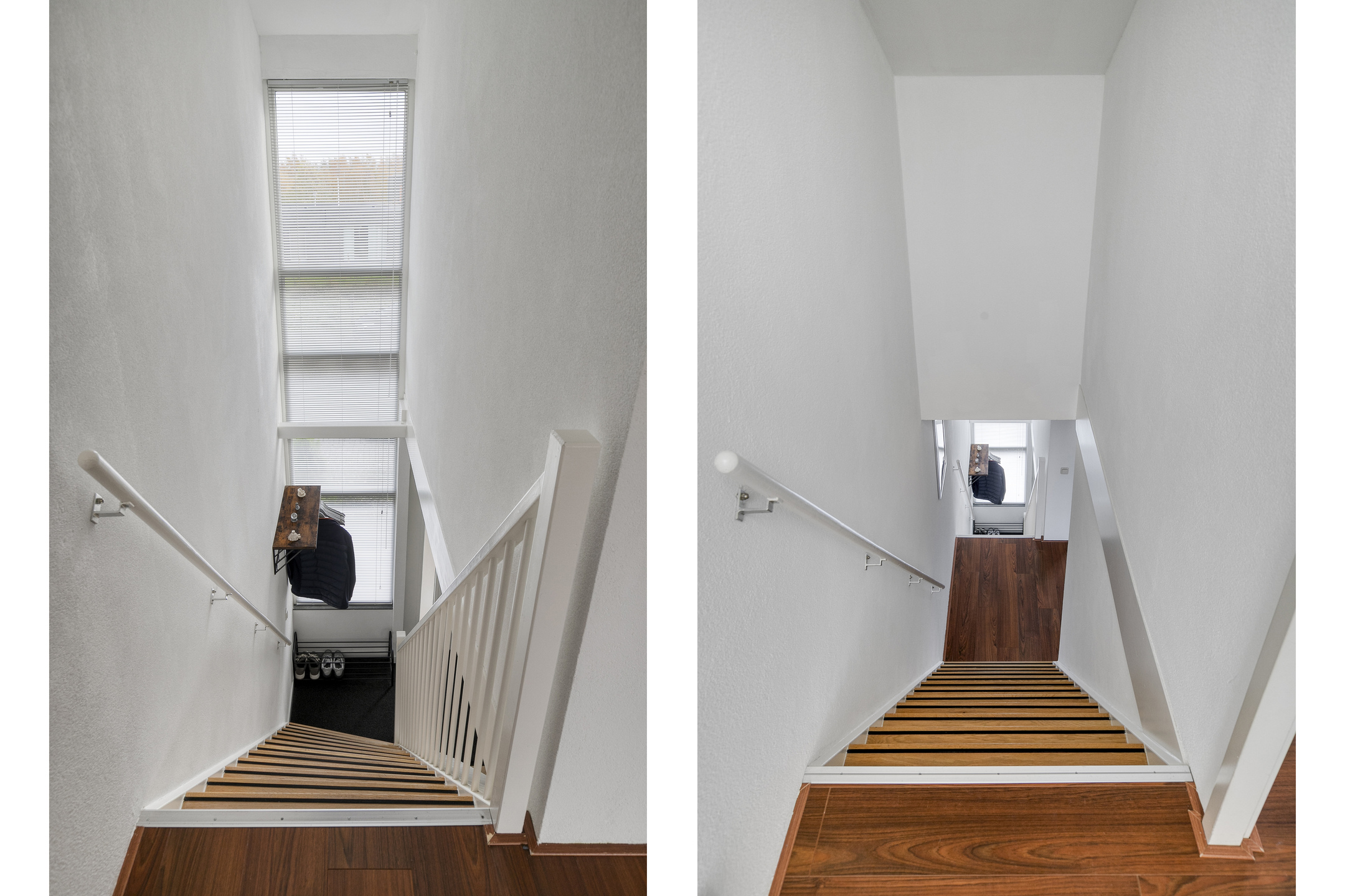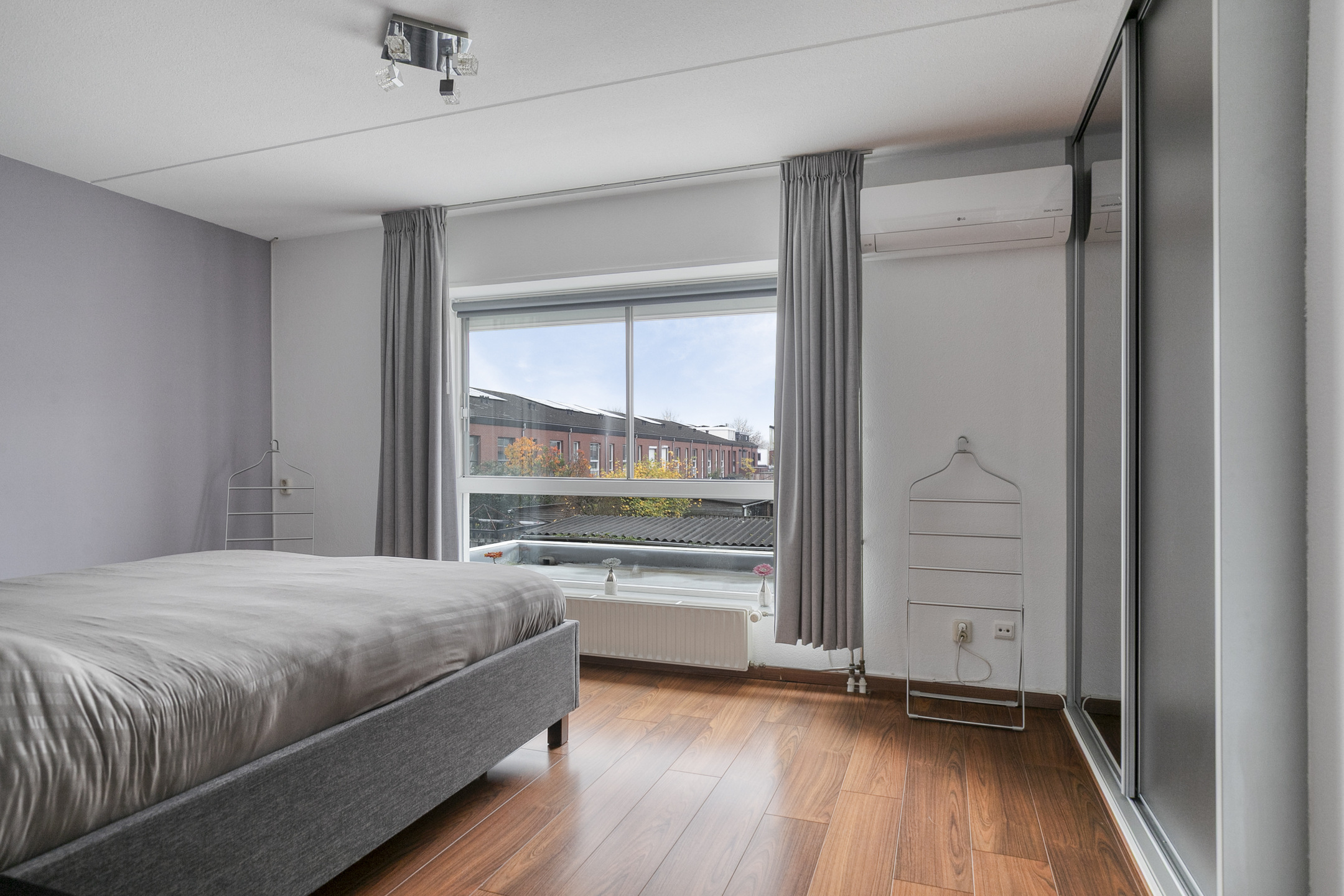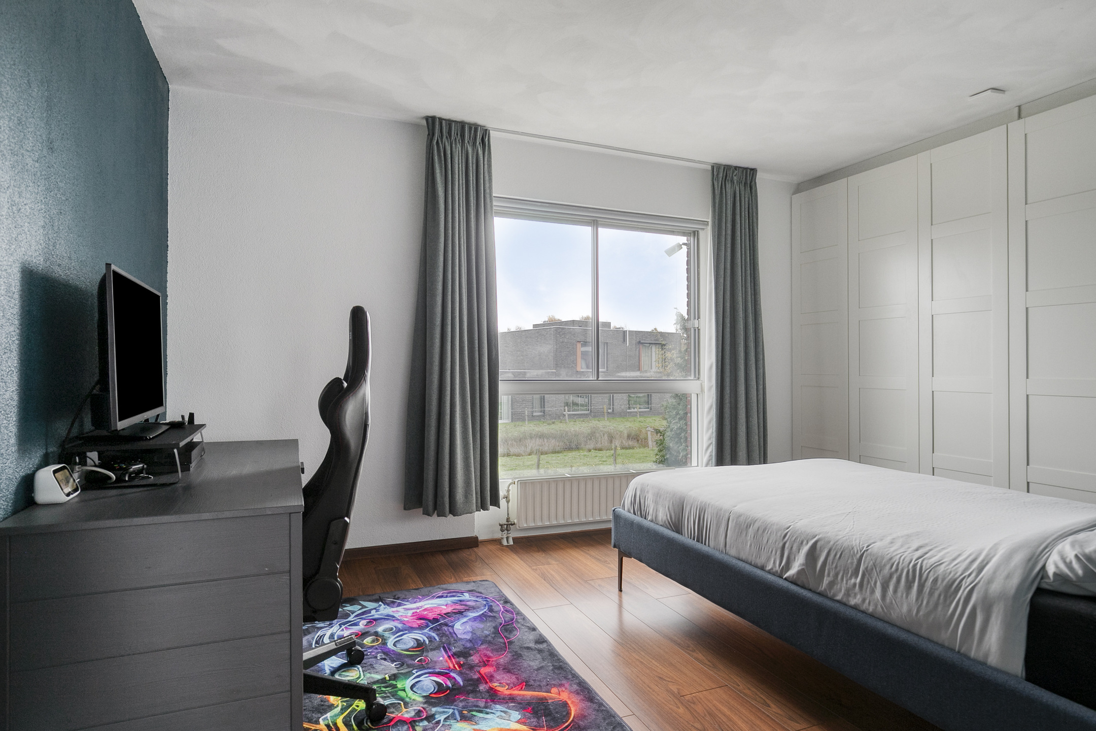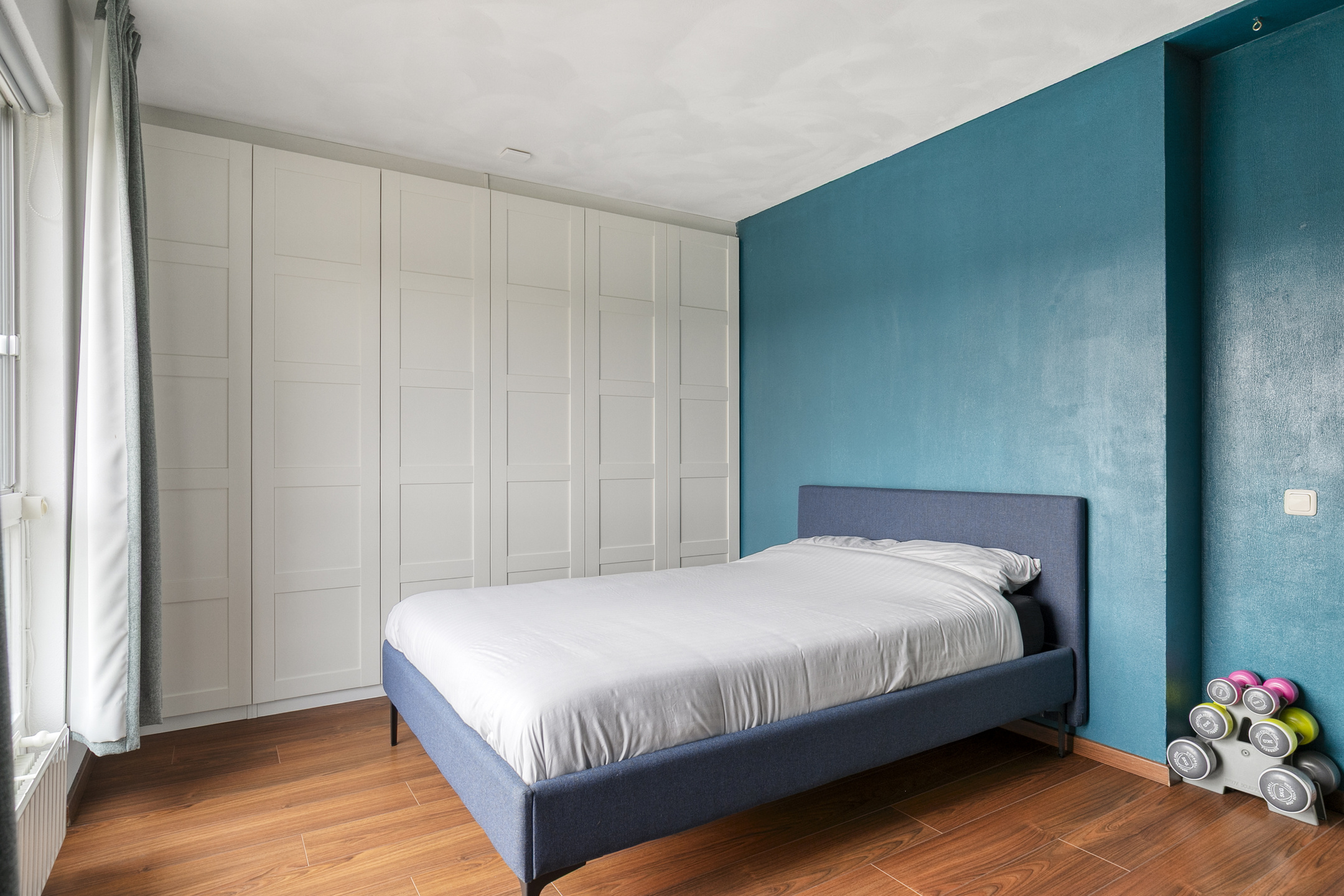 De slaapkamer aan de voorzijde (ca. 14 m²) beschikt over een laminaatvloer, spachtelputz wanden en een elektrisch bedienbaar screen. De hoofdslaapkamer aan de achterzijde is eveneens keurig afgewerkt en voorzien van een rolluik en vaste kast die doorloopt onder de trapopgang.