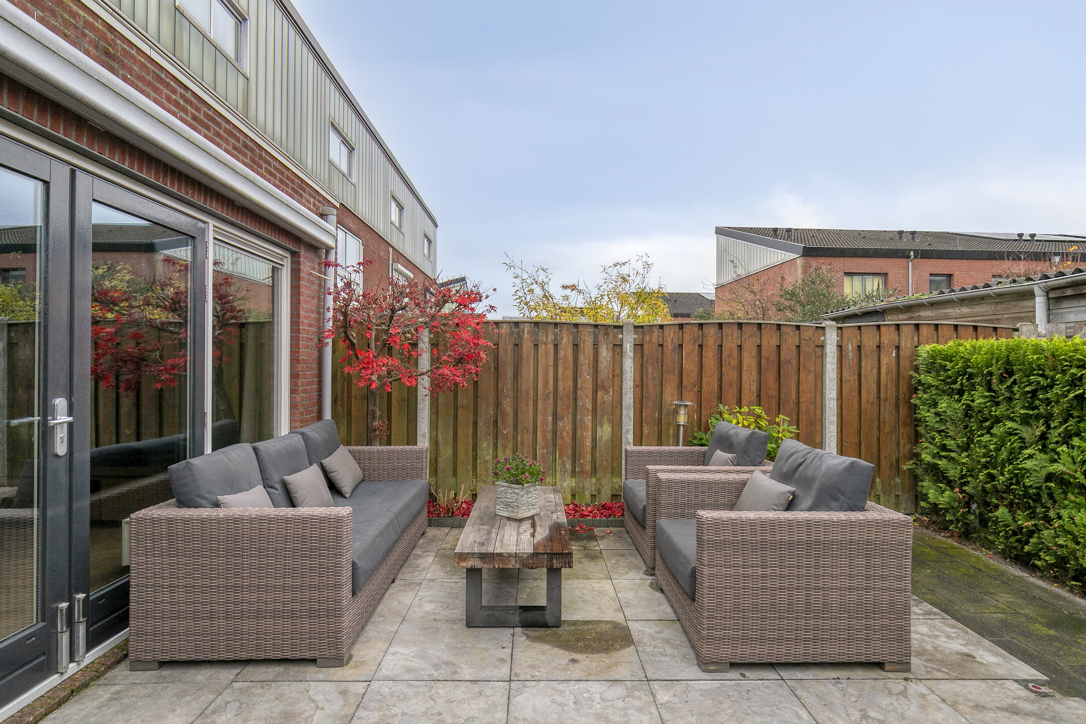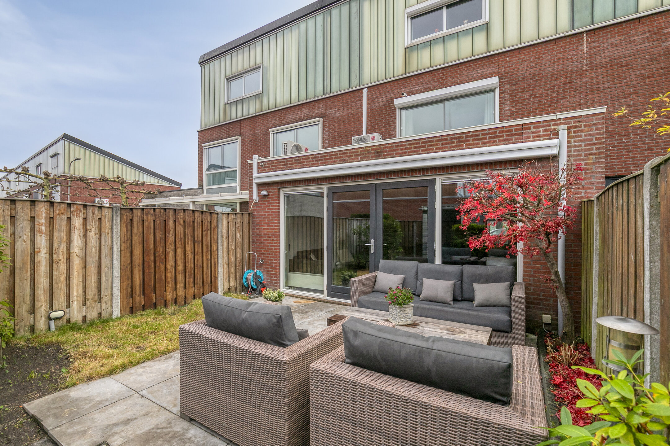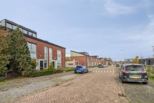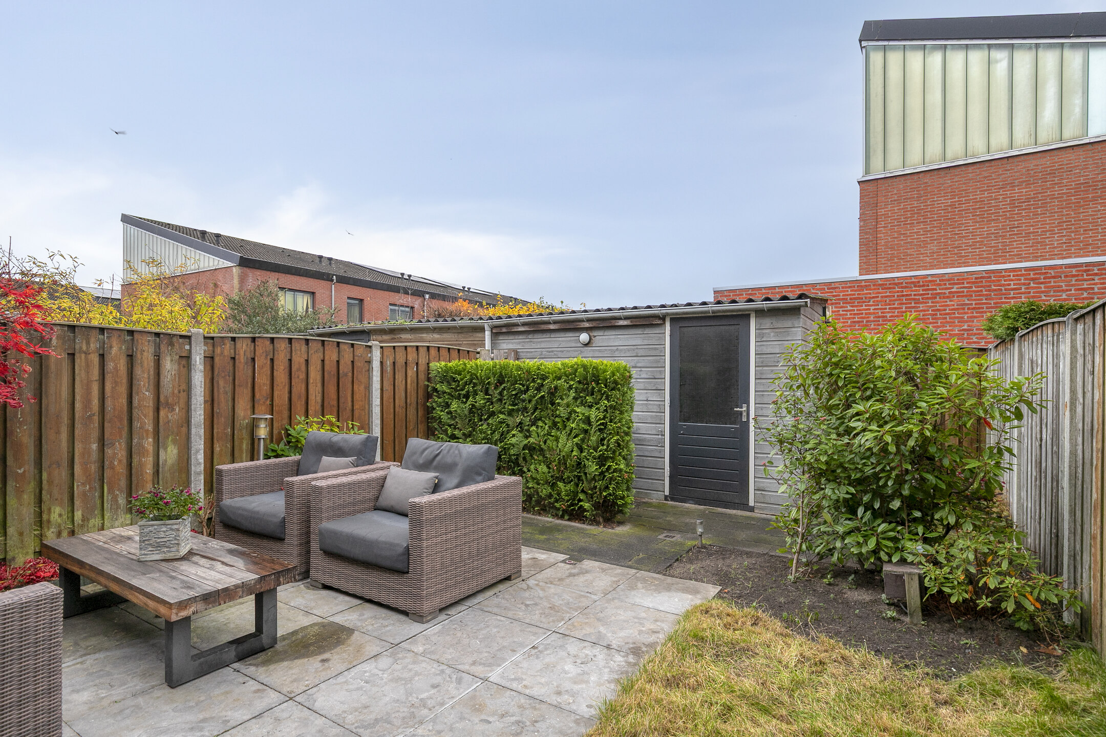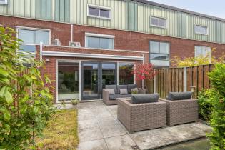 De achtertuin ligt op het westen, is verzorgd aangelegd en biedt een fijne combinatie van terras, gazon en groene borders. Achterin de tuin staat een houten berging en er is een achterom aanwezig. Aan de achtergevel is een elektrisch zonnescherm geplaatst en er is een buitenkraan.