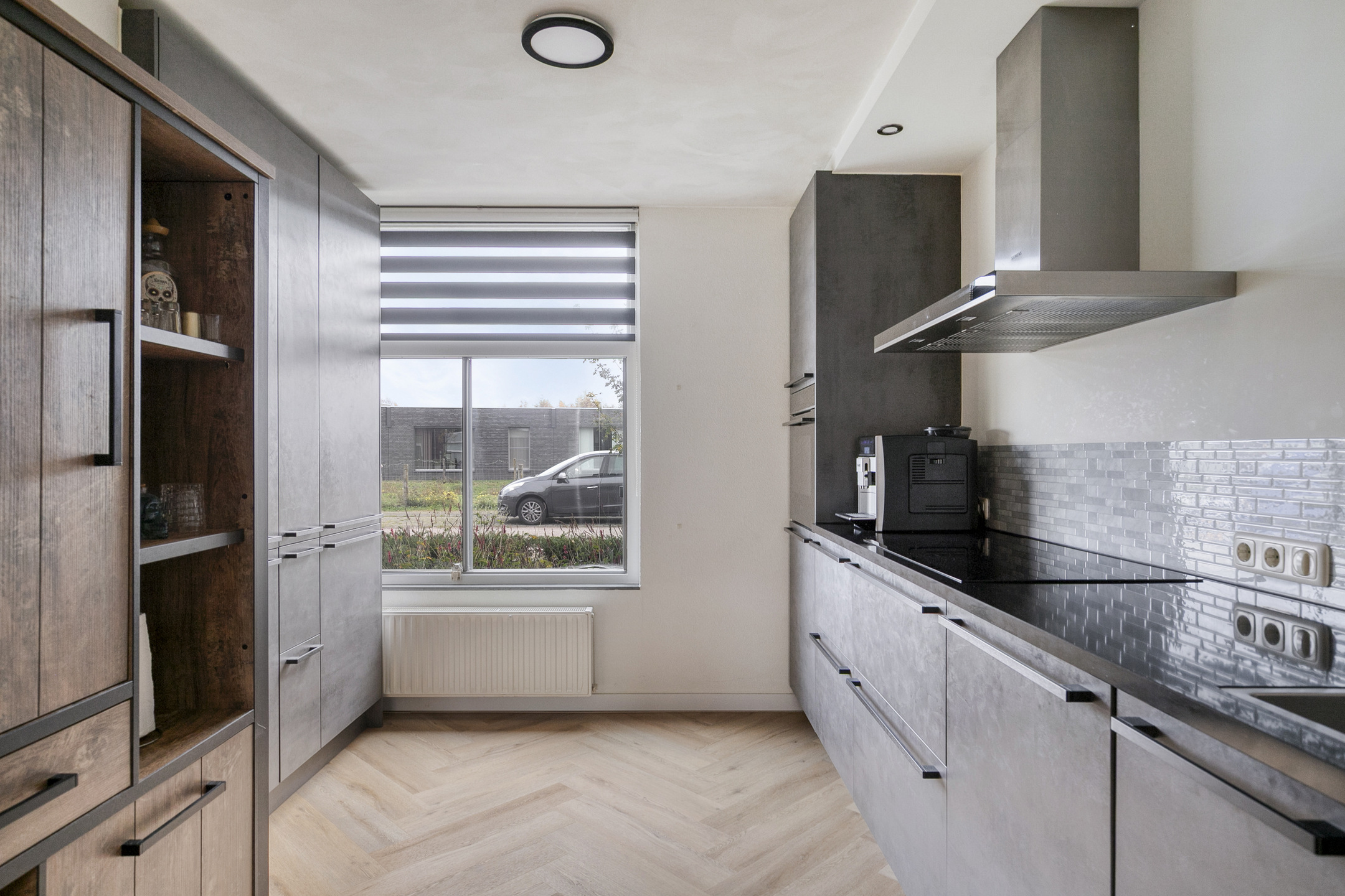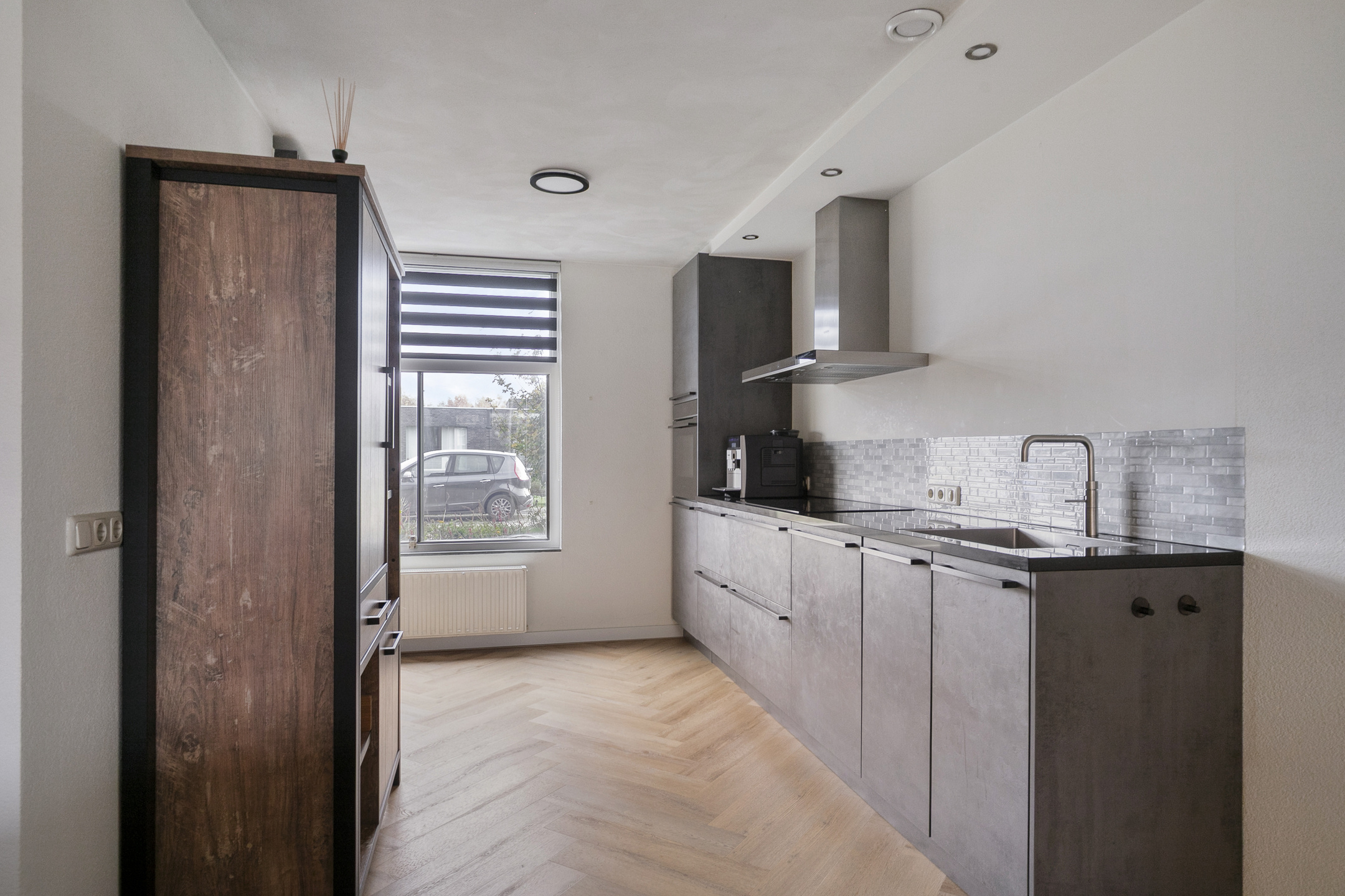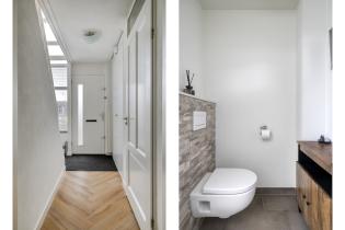 Via de verzorgde voortuin bereik je de entree van de woning. In de hal bevinden zich de trapopgang, meterkast en toiletruimte, die in 2022 volledig is vernieuwd en voorzien van glad gestuukte wanden, een hangend closet en een moderne tegelvloer. De fraaie visgraatvloer loopt vanuit de hal door in de woonkamer en zorgt voor een stijlvolle uitstraling.