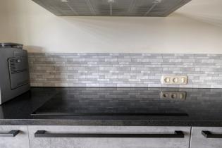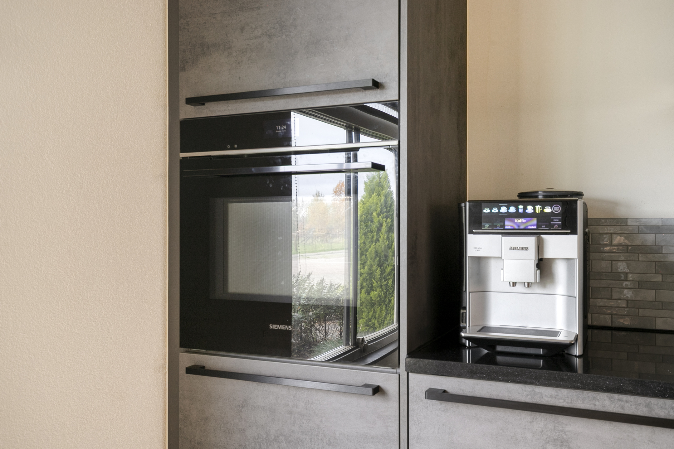 De eethoek ligt centraal in de ruimte en sluit aan op de open keuken aan de voorzijde. De keuken is opgesteld in een rechte opstelling met een extra kastenwand en voorzien van hoogwaardige Siemens inbouwapparatuur, waaronder een inductiekookplaat, afzuigkap, combi-oven, vaatwasser, koelkast, vriezer en een Quooker voor direct kokend water.