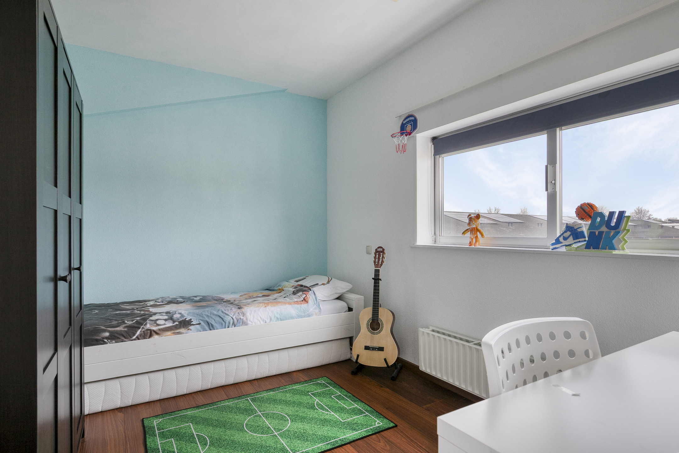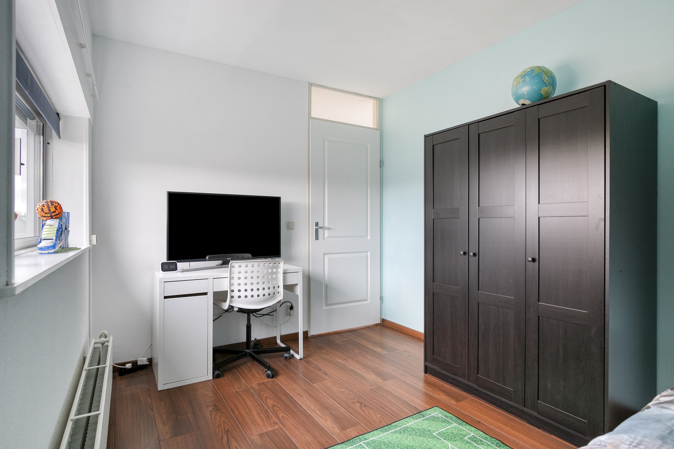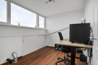 De 3e slaapkamer (achterzijde, ca. 9,5 m²) beschikt over een laminaatvloer, spachtelputz wanden en een elektrisch rolluik. De 4e slaapkamer (voorzijde, ca. 9 m²) is eveneens voorzien van een laminaatvloer en biedt handige diepe bergruimte onder het schuine dak. De slaapkamer is tevens voorzien van elektrisch bedienbare screens. Het plafond op deze verdieping is overal afgewerkt met schuurwerk.