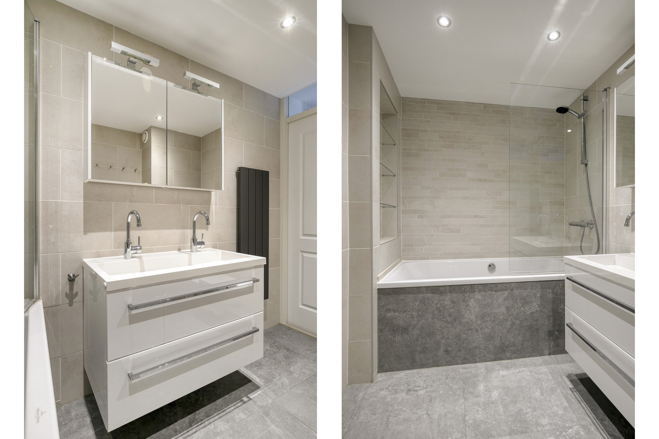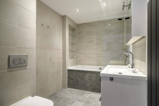 De badkamer, gemoderniseerd in 2022, is volledig betegeld en uitgerust met een diep ligbad met douche, dubbele wastafel in meubel, designradiator en een 2e toilet. De mechanische ventilatie is in 2024 vervangen. Deze gaat automatisch aan en uit bij het douchen.