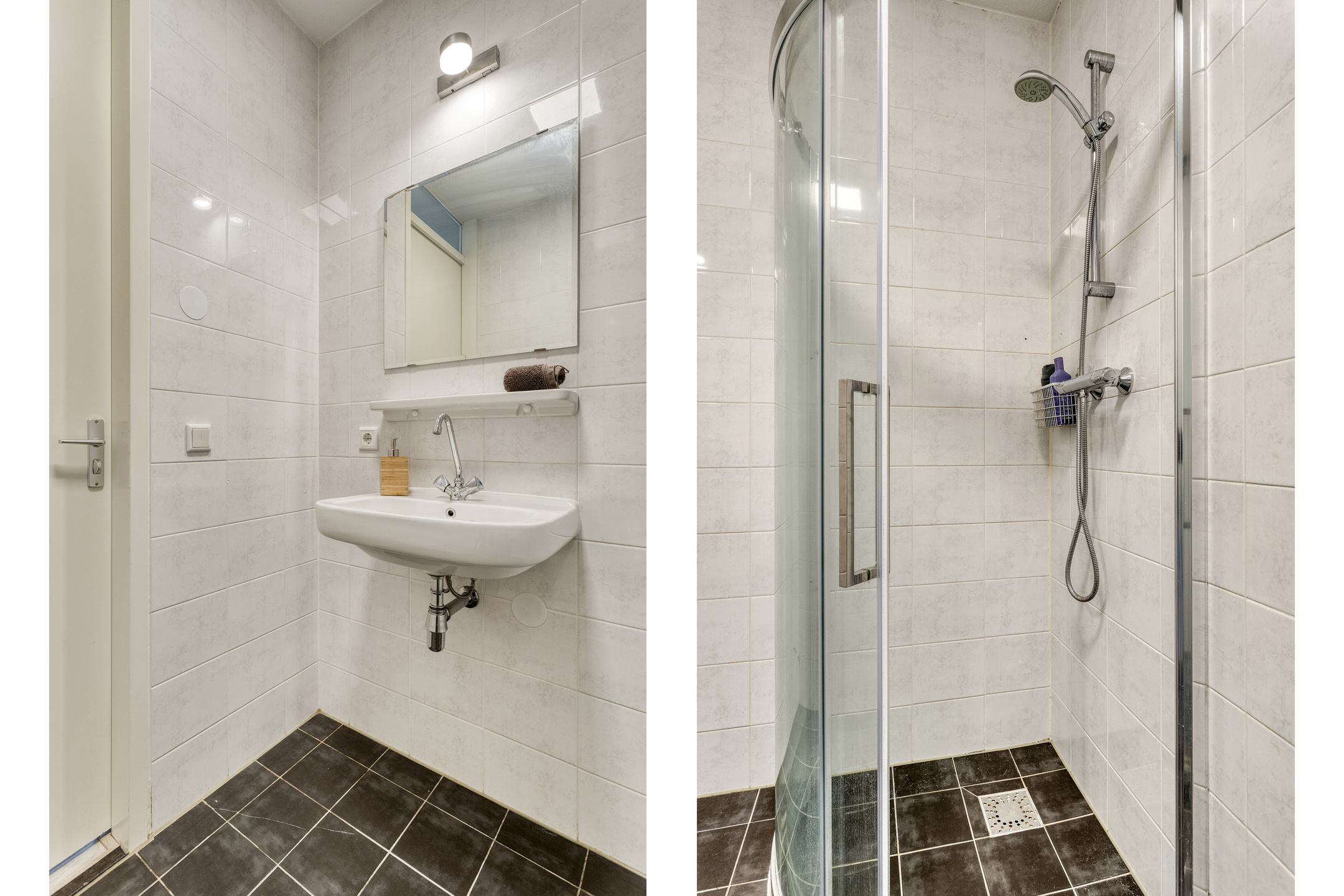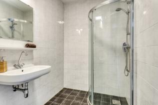 De badkamer is strak en volledig betegeld, met een moderne douchecabine, wastafel en wandspiegel. Het separate toilet is afgewerkt met deels betegelde wanden en beschikt over een fonteintje.