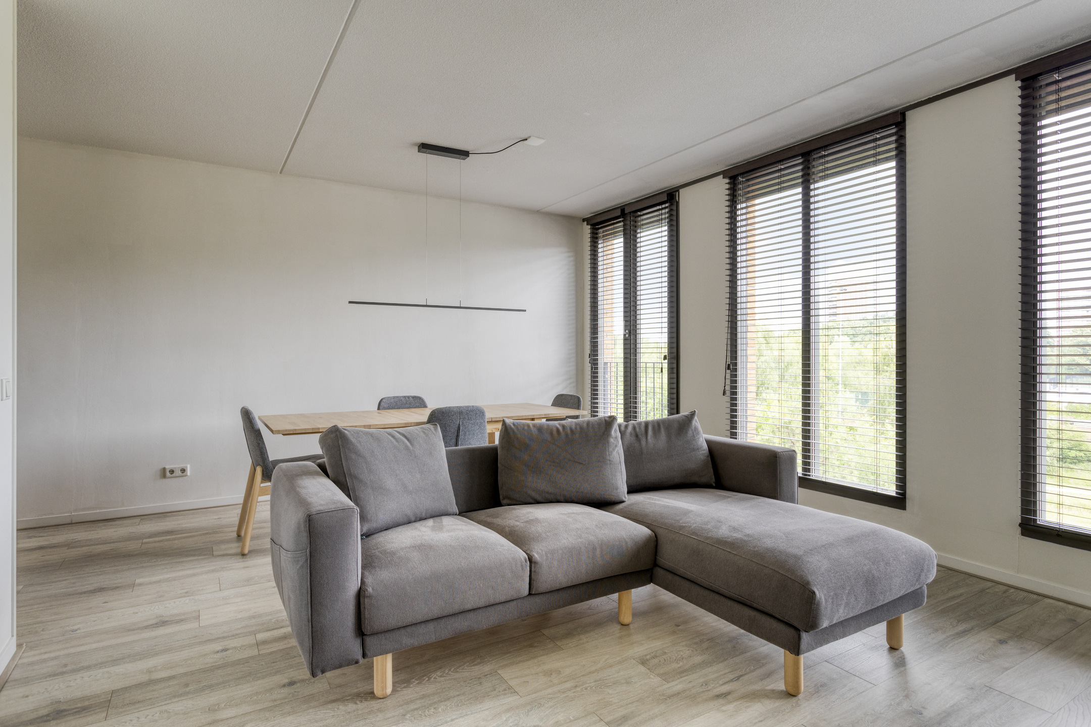 De woonkamer is verrassend ruim en krijgt door de grote ramen en twee Franse balkons een prachtige lichtinval. Vanaf hier heb je vrij uitzicht op de omgeving. Een slimme scheidingswand zorgt ervoor dat de ruimte zich ook perfect leent voor een werk- of leeshoek.