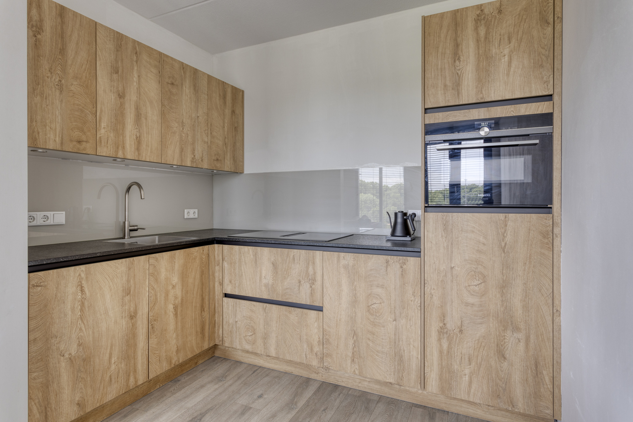 De open keuken is direct aan de woonkamer verbonden en vormt een mooi geheel met de rest van het interieur. De moderne keuken in L-opstelling is uitgevoerd met kwalitatieve Siemens inbouwapparatuur, waaronder een vaatwasser, combi-oven, koelkast en een 4-pits inductiekookplaat met geïntegreerde afzuiging. Dankzij de doordachte indeling is er veel werk- en opbergruimte beschikbaar.