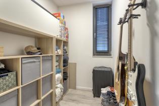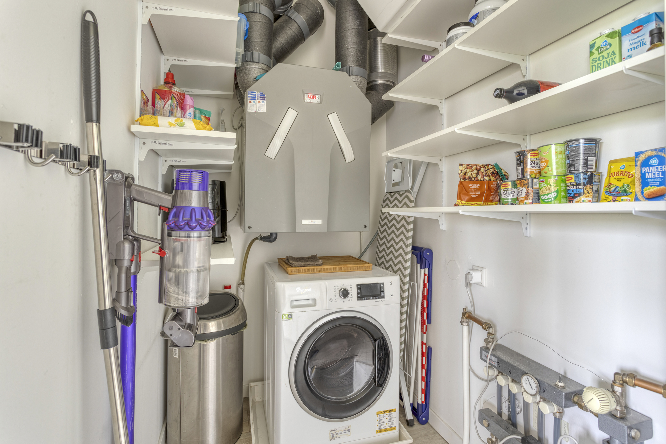 In de praktische berging bevinden zich de aansluitingen voor wasmachine en droger, de unit voor mechanische ventilatie met filters, en de verdeler voor de vloerverwarming.