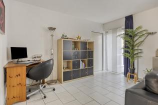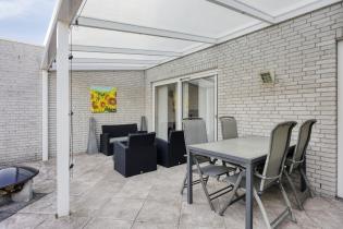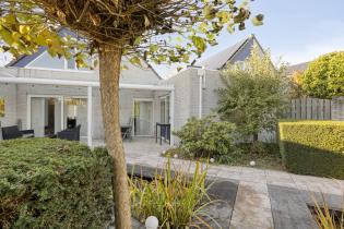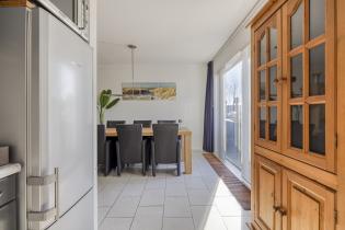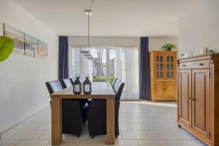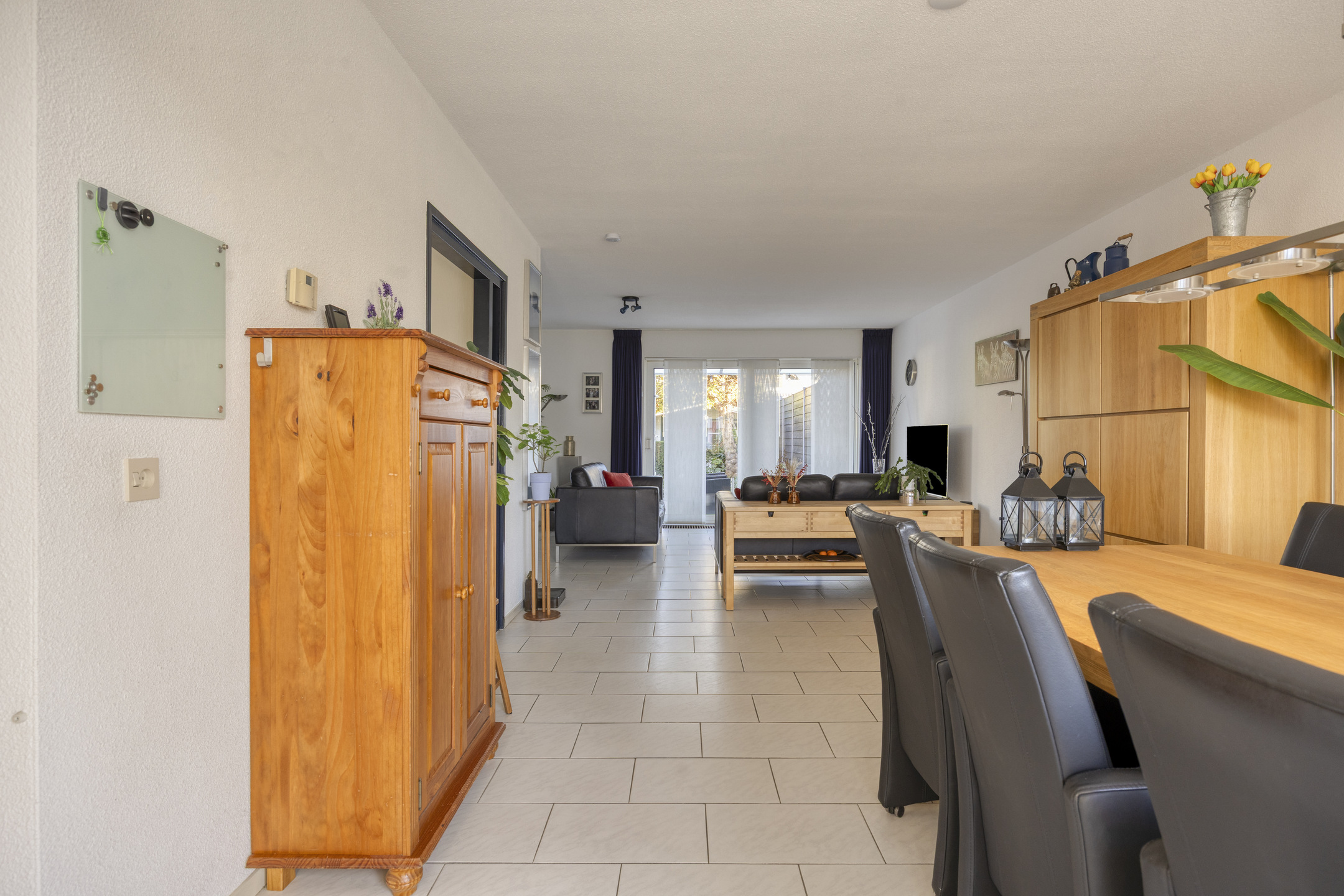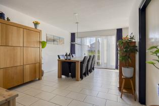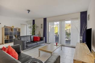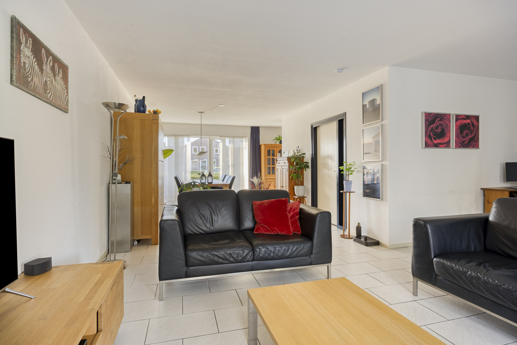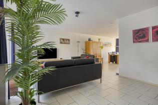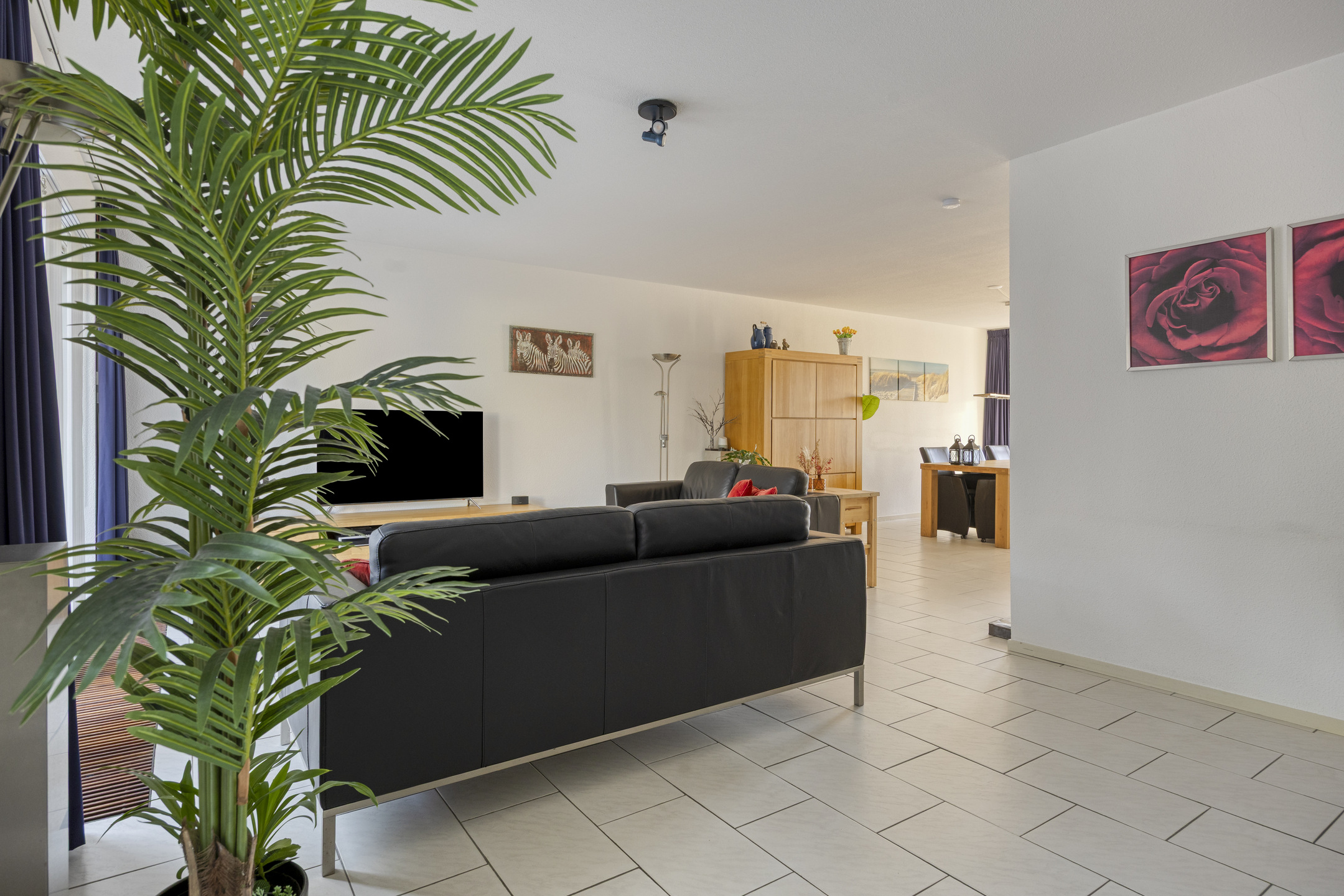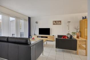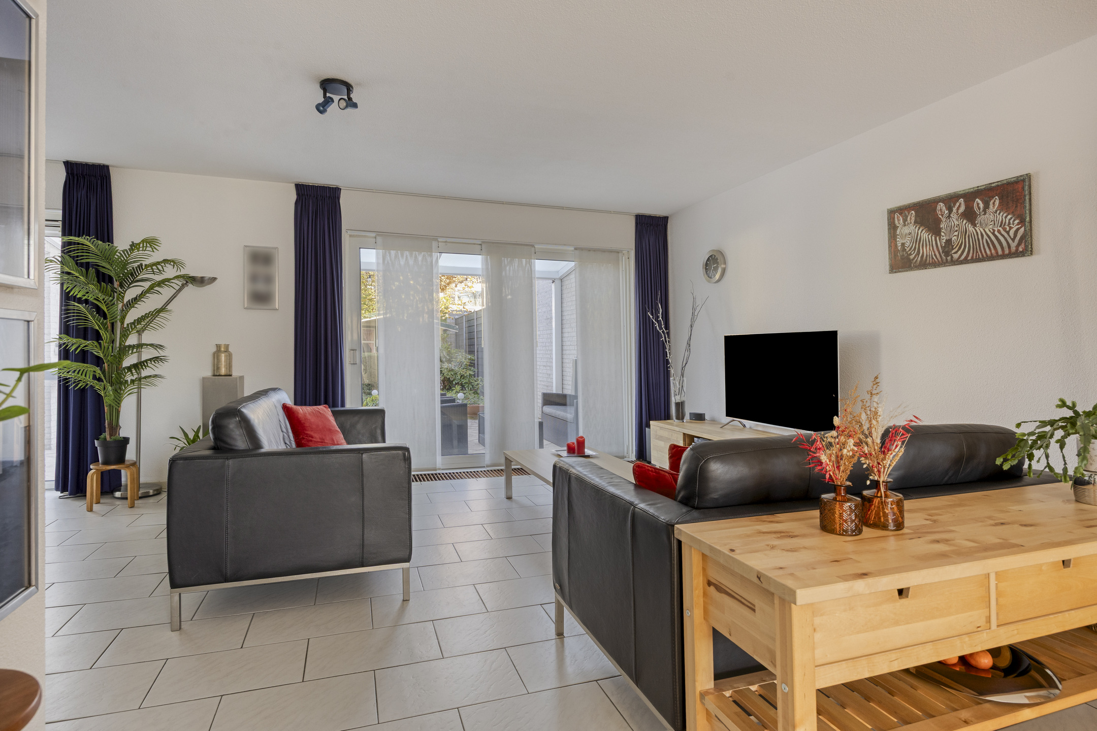De ruime woonkamer is licht en comfortabel, met een zithoek aan de tuinzijde en een eethoek bij de keuken. De lichte tegelvloer is voorzien van vloerverwarming (in de woonkamer) en de wanden zijn afgewerkt met spuitwerk. Grote ramen en een schuifpui zorgen voor een prettige lichtinval en direct contact met de tuin.