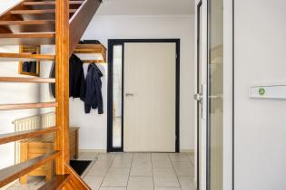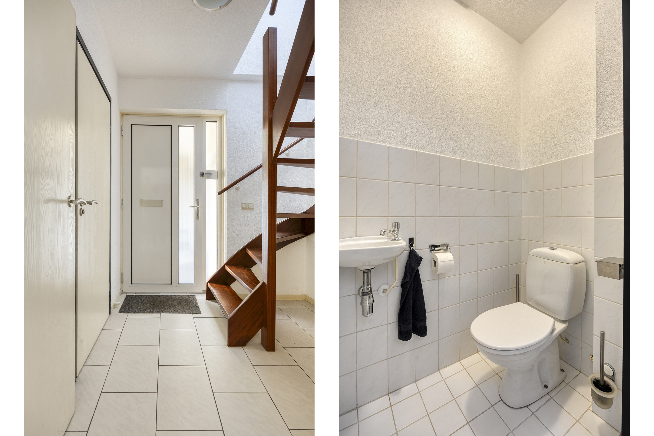Via de oprit met ruimte voor twee auto’s bereiken we de entree van de woning. In de hal bevinden zich de meterkast, trapopgang en toiletruimte met fonteintje.