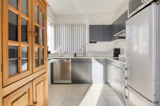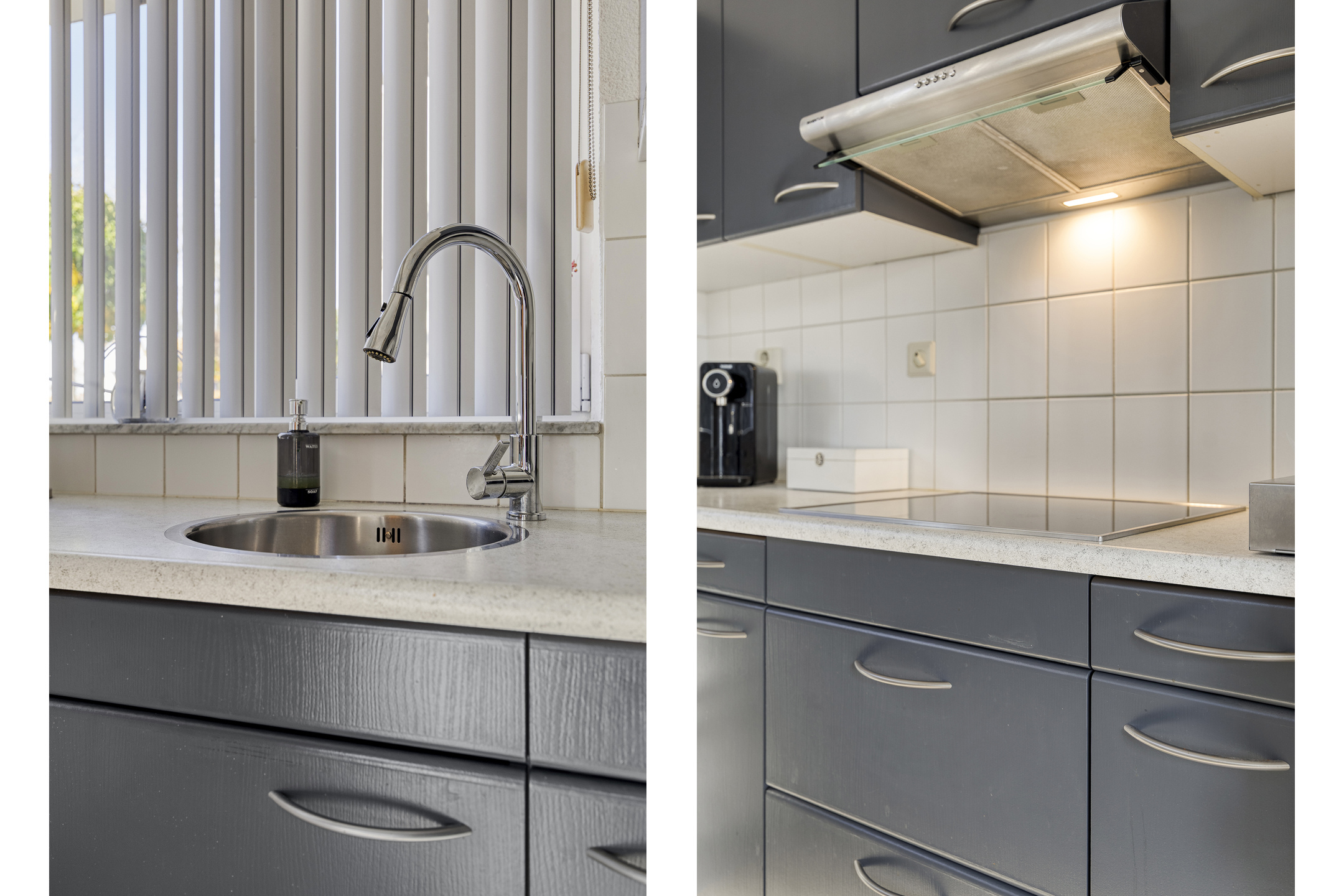 De keuken ligt aan de voorzijde en is opgesteld in een hoekopstelling met diverse inbouwapparatuur: inductiekookplaat, afzuigkap, vaatwasser en bovenkasten die zorgen voor extra bergruimte.