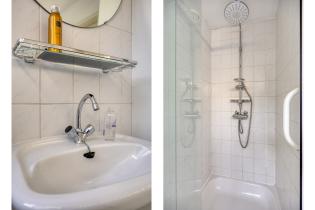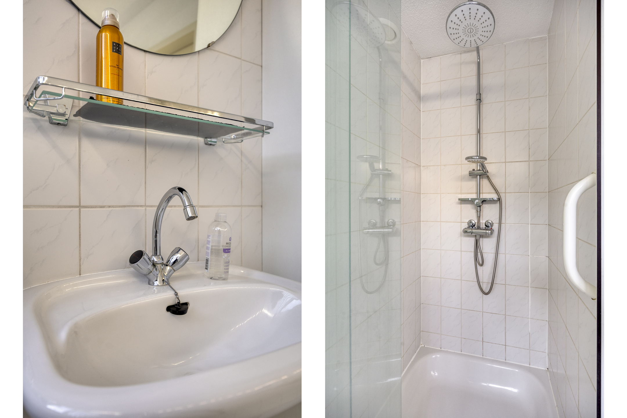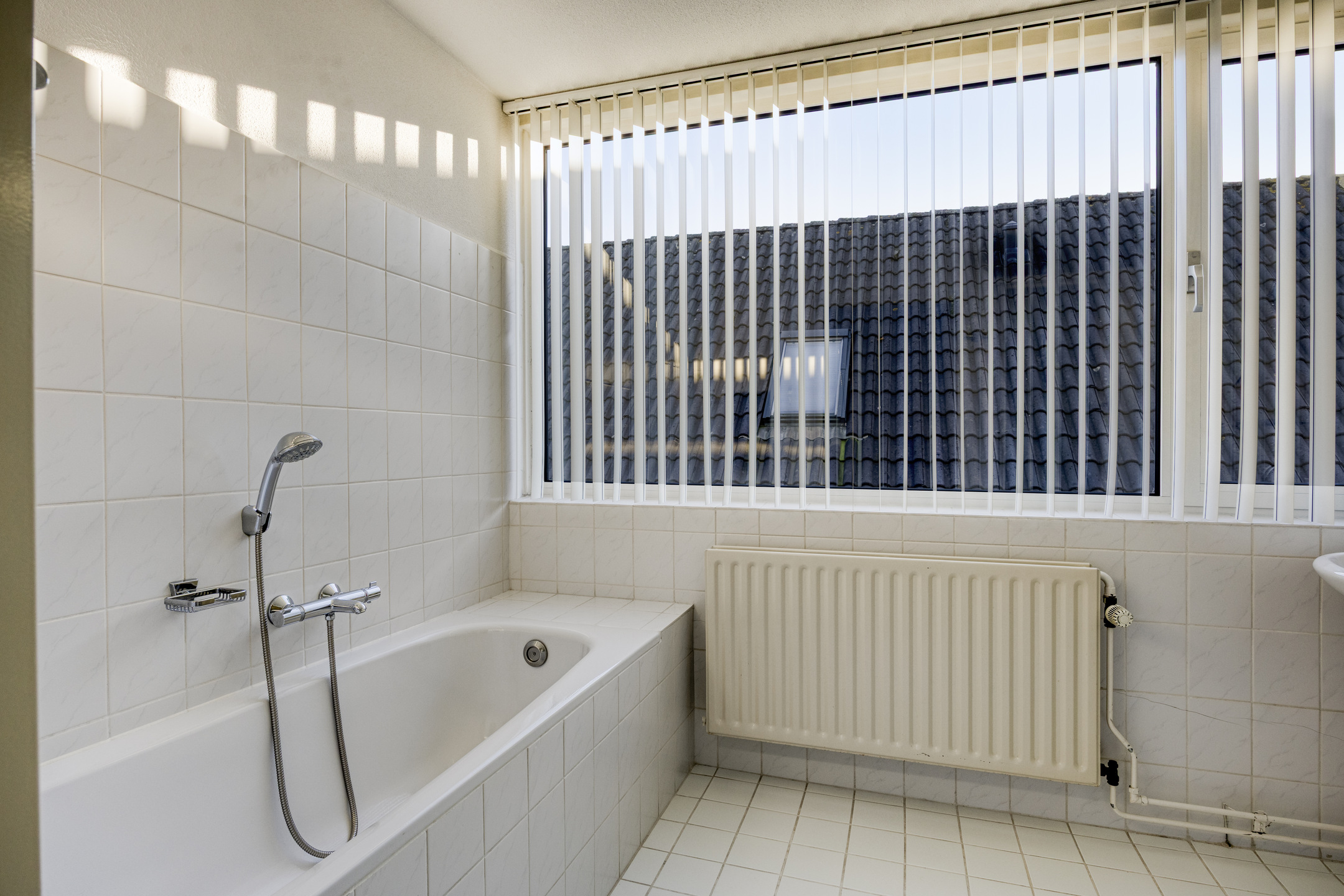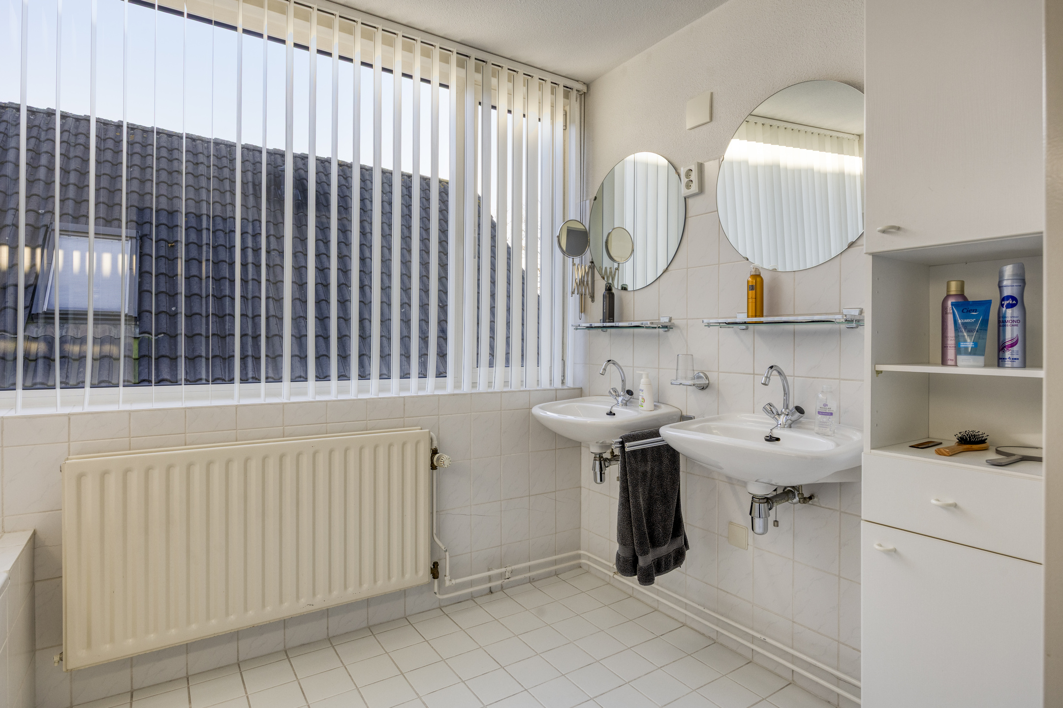 De badkamer is deels betegeld, uitgerust met een dubbele wastafel, douche en ligbad, en oogt heerlijk licht en ruim dankzij de dakkapel. Daarnaast is er een separaat toilet met fonteintje aanwezig op de overloop.