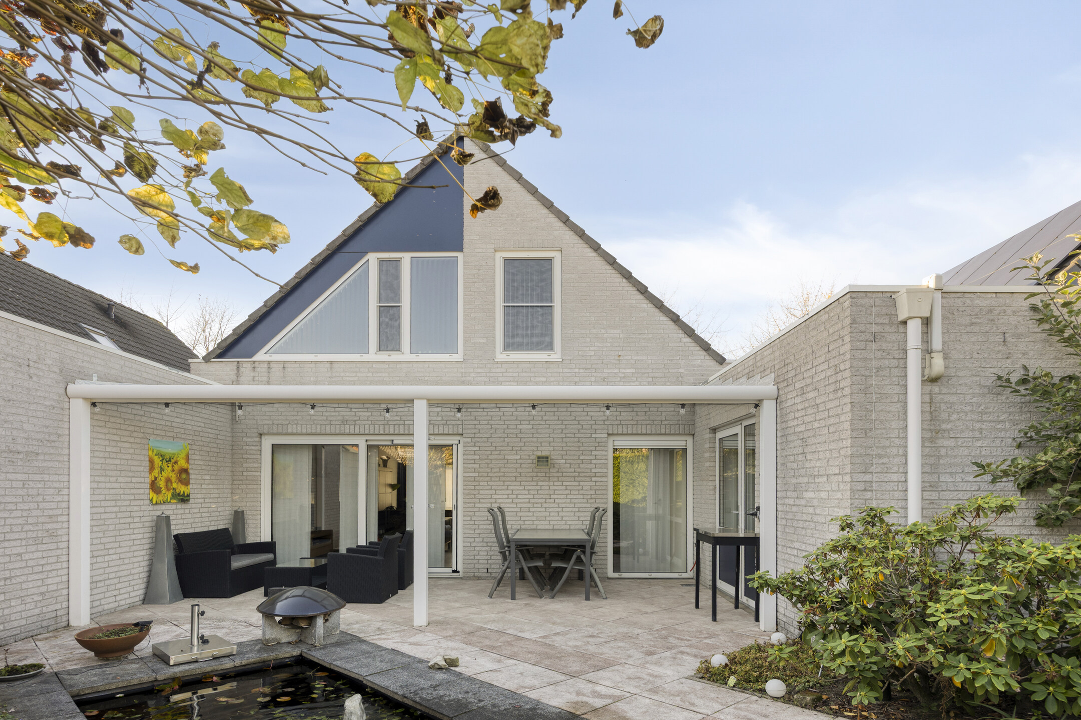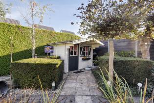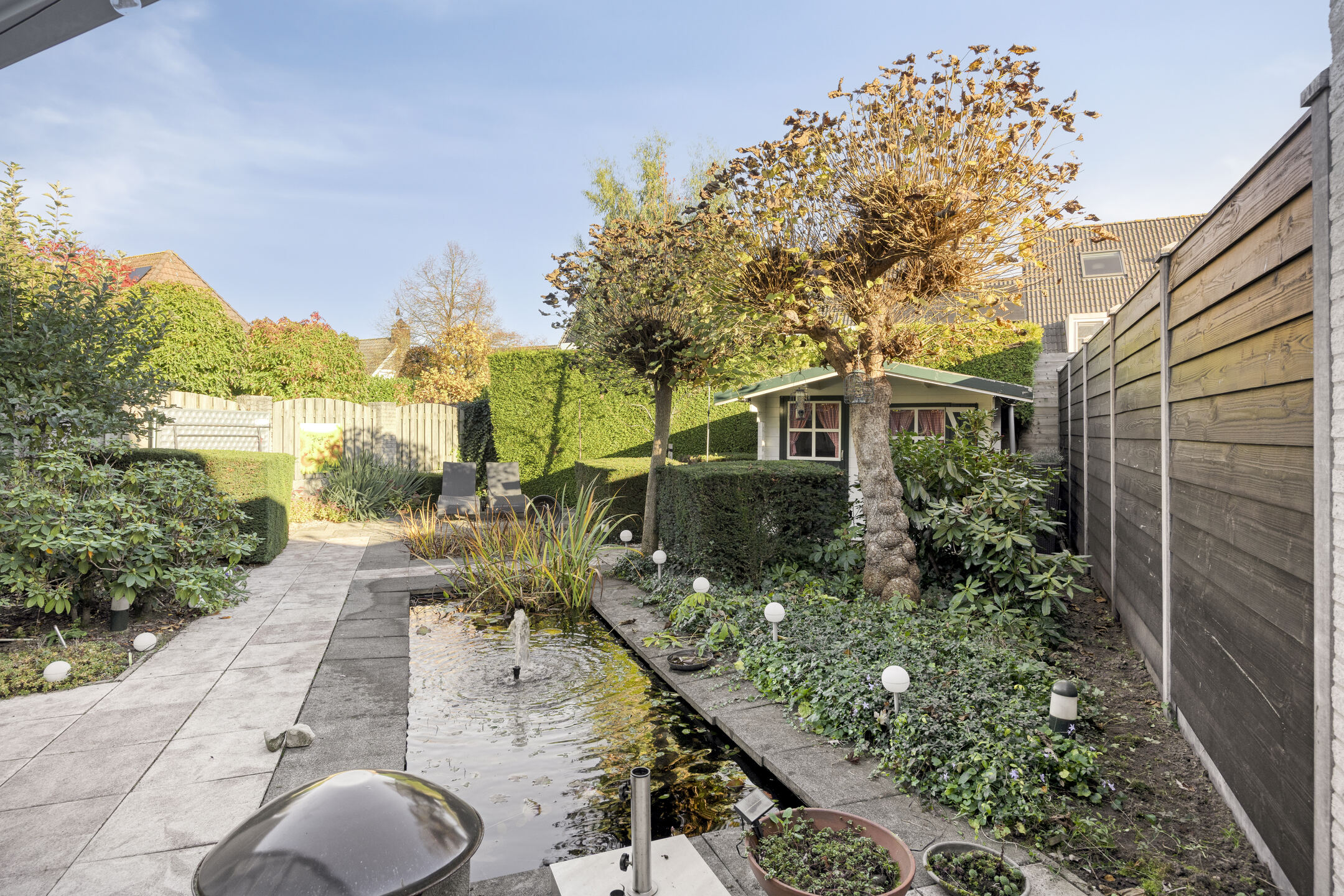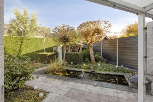 De achtertuin ligt op het zuidoosten, biedt veel privacy en is met zorg aangelegd. Er is een terras met sierbestrating, een overkapping direct aan de woning, een vijver, beplanting en achterin de tuin een houten berging. Een heerlijke plek om het hele jaar door van de zon en de rust te genieten.