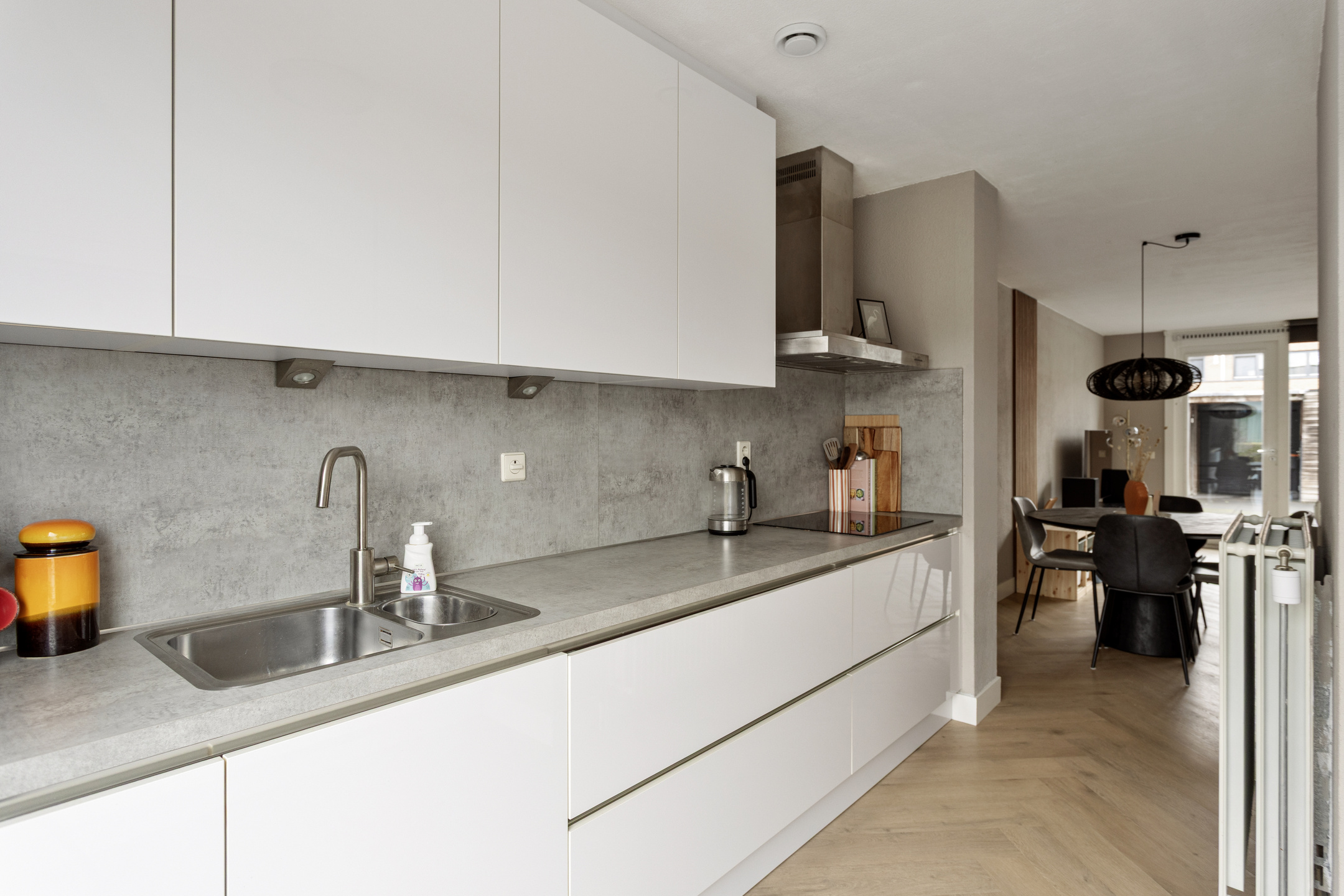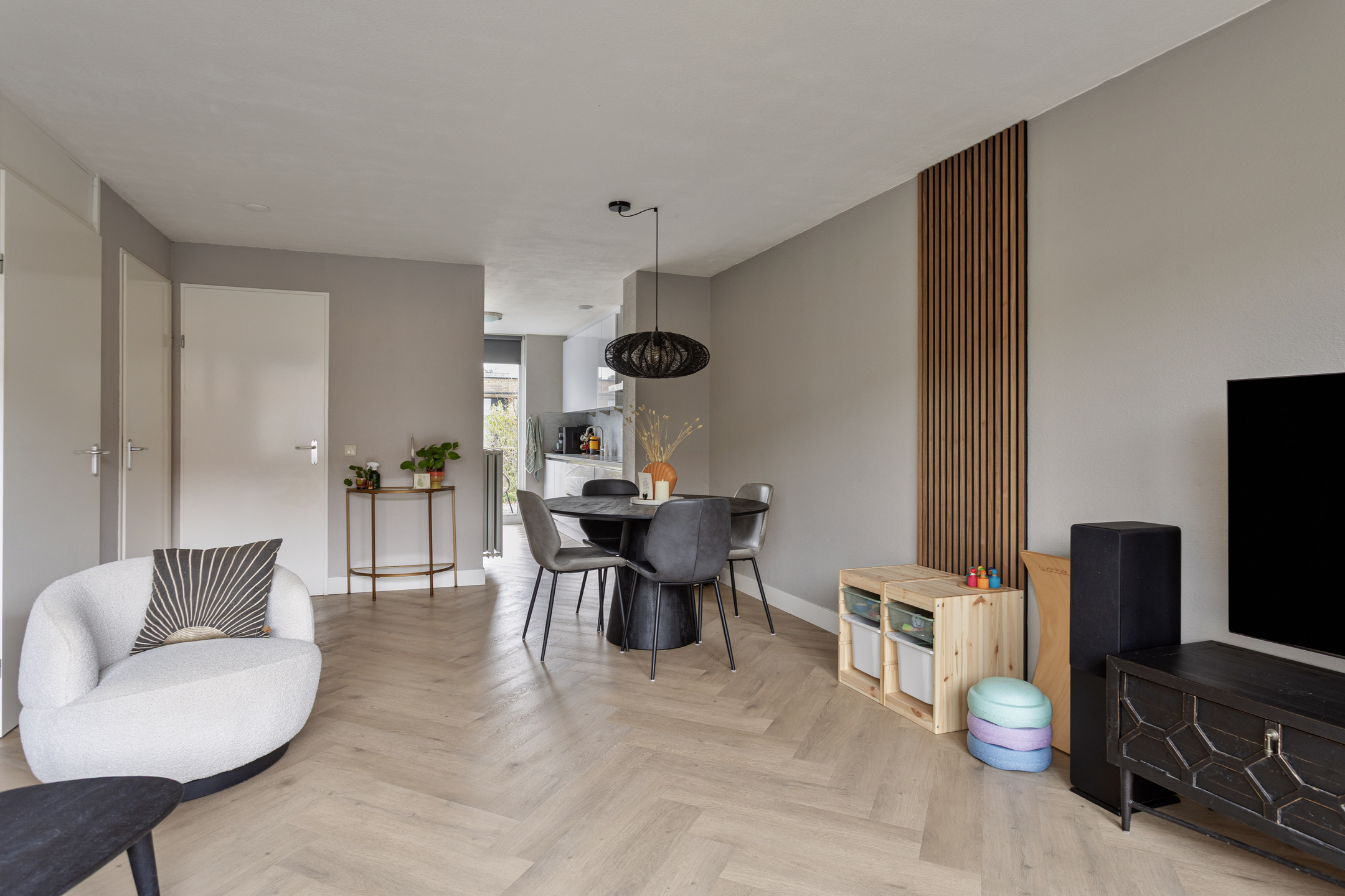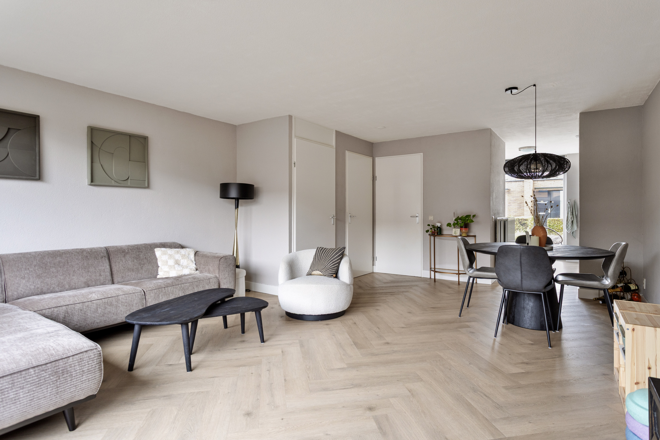 De gehele begane grond is afgewerkt met een stijlvolle visgraat PVC-vloer en de wanden met spachtelputz, wat de ruimte een moderne en verzorgde uitstraling geeft.