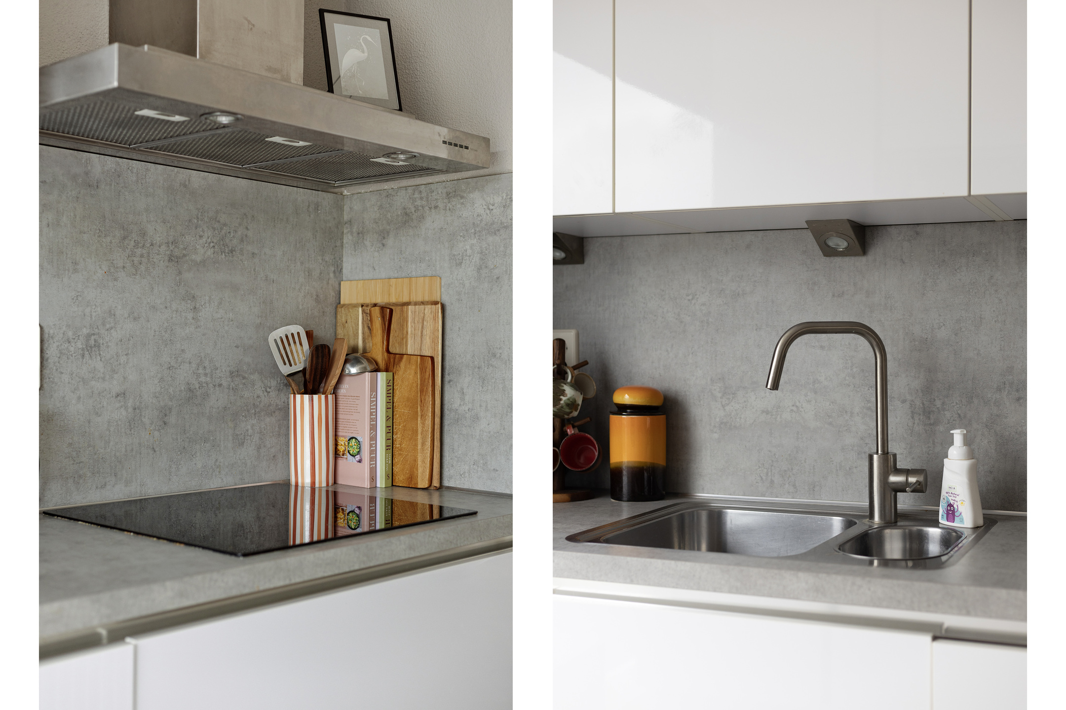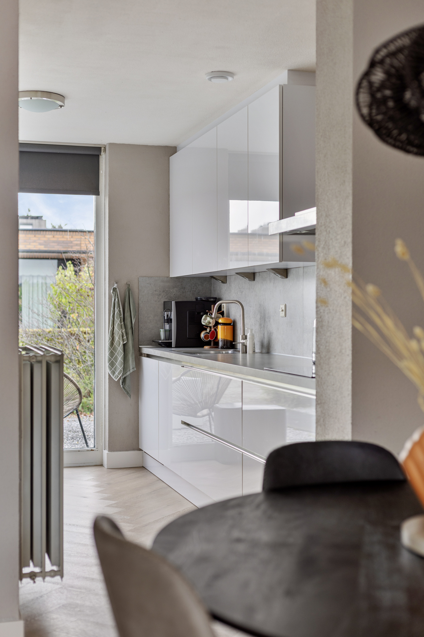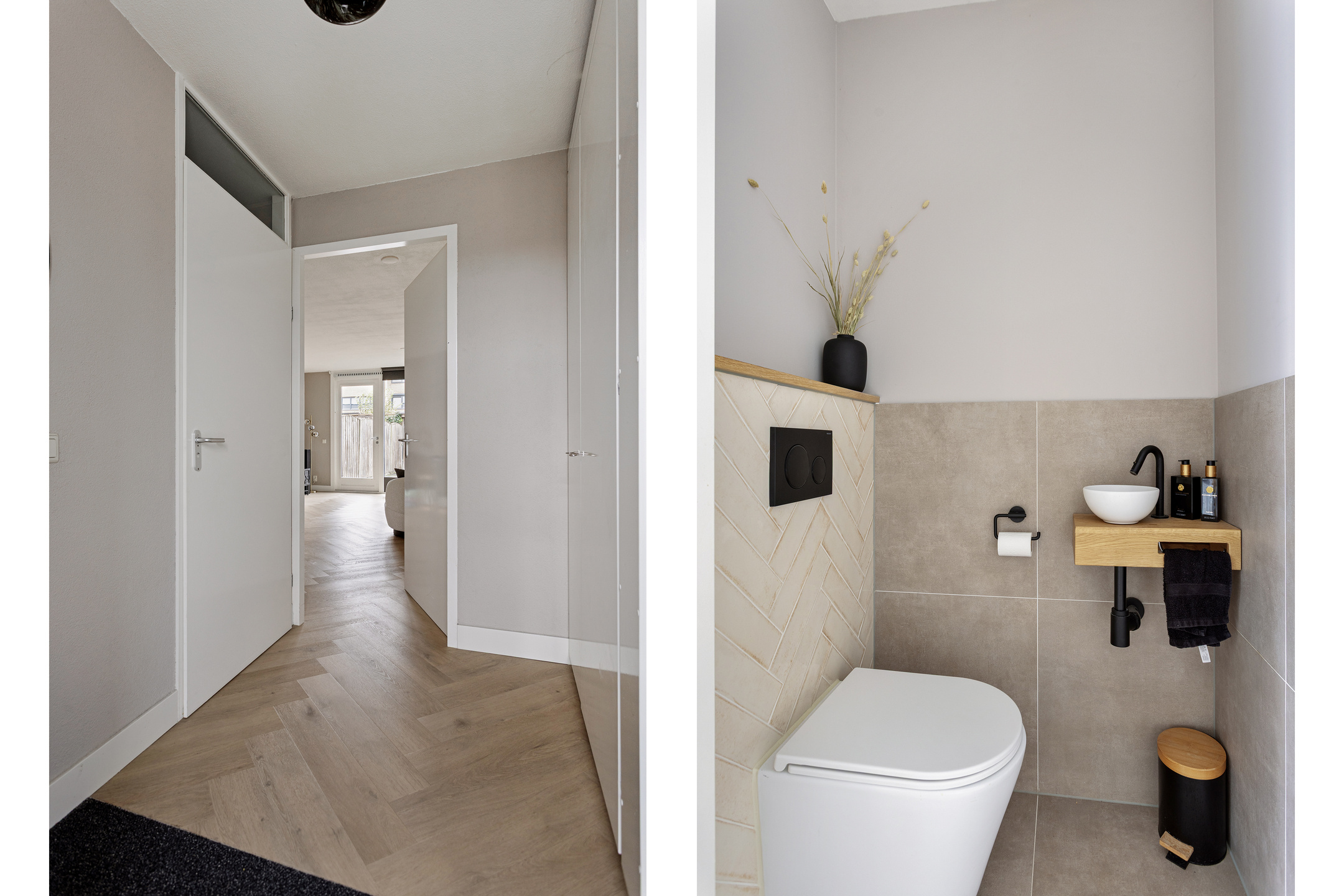 De gehele begane grond is afgewerkt met een stijlvolle visgraat PVC-vloer en de wanden met spachtelputz, wat de ruimte een moderne en verzorgde uitstraling geeft.