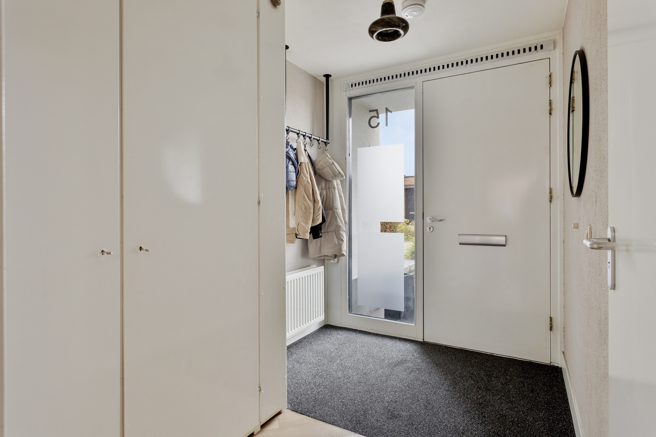 De overloop biedt toegang tot alle vertrekken en beschikt over een praktische vaste kast met opstelling voor de was- en droogapparatuur en de mechanische ventilatie-unit. De wanden van de overloop zijn afgewerkt met spachtelputz.