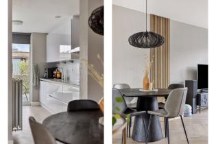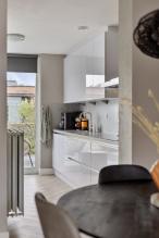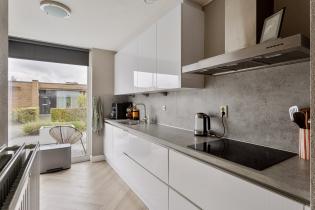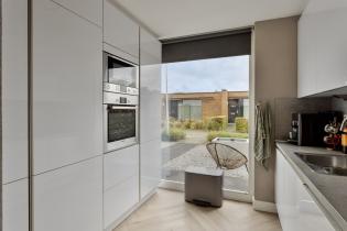 De moderne keuken is aan de voorzijde gesitueerd in een dubbele opstelling, voorzien van diverse inbouwapparatuur, waaronder een koelkast, afzuigkap, oven, magnetron, inductiekookplaat en vaatwasser.