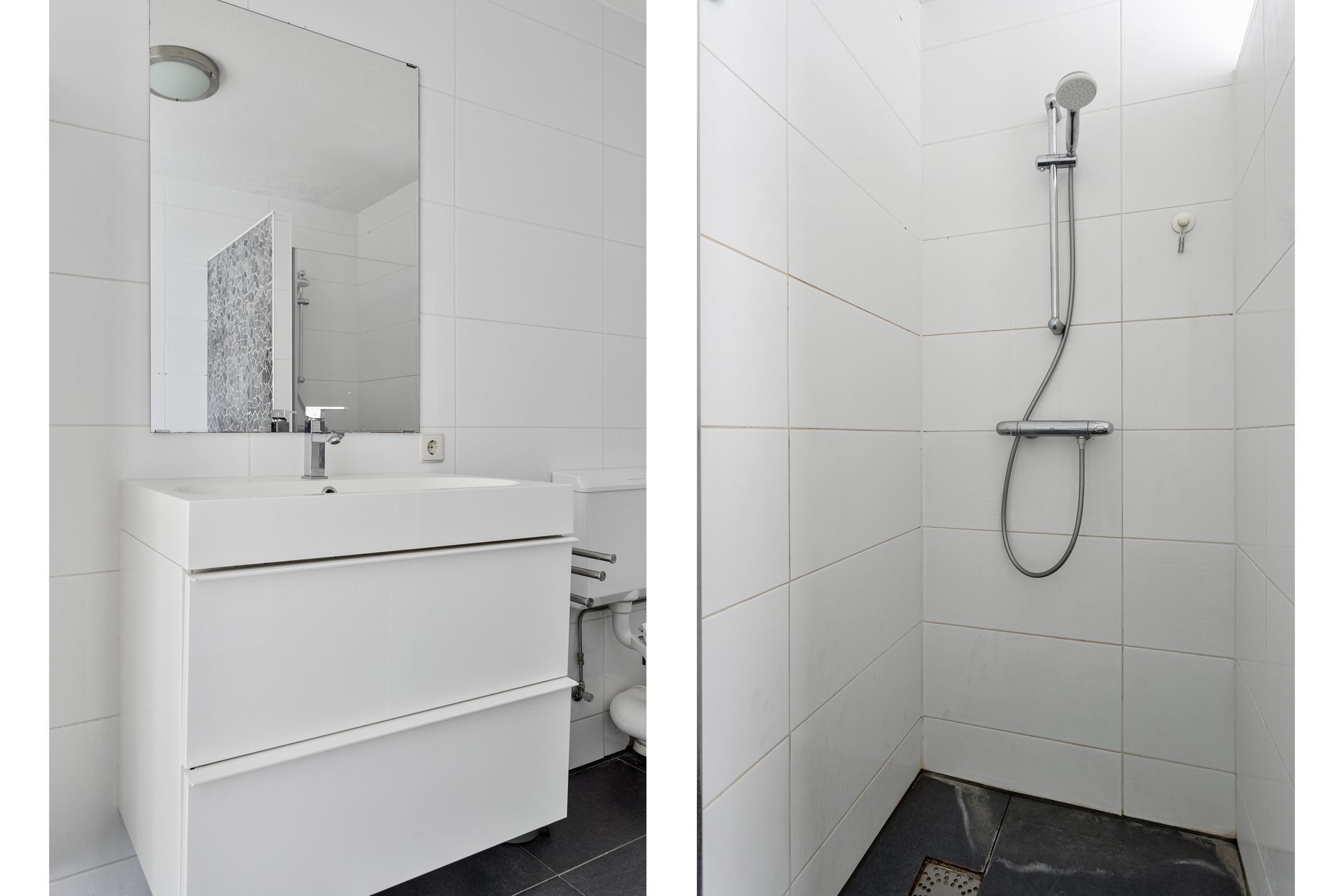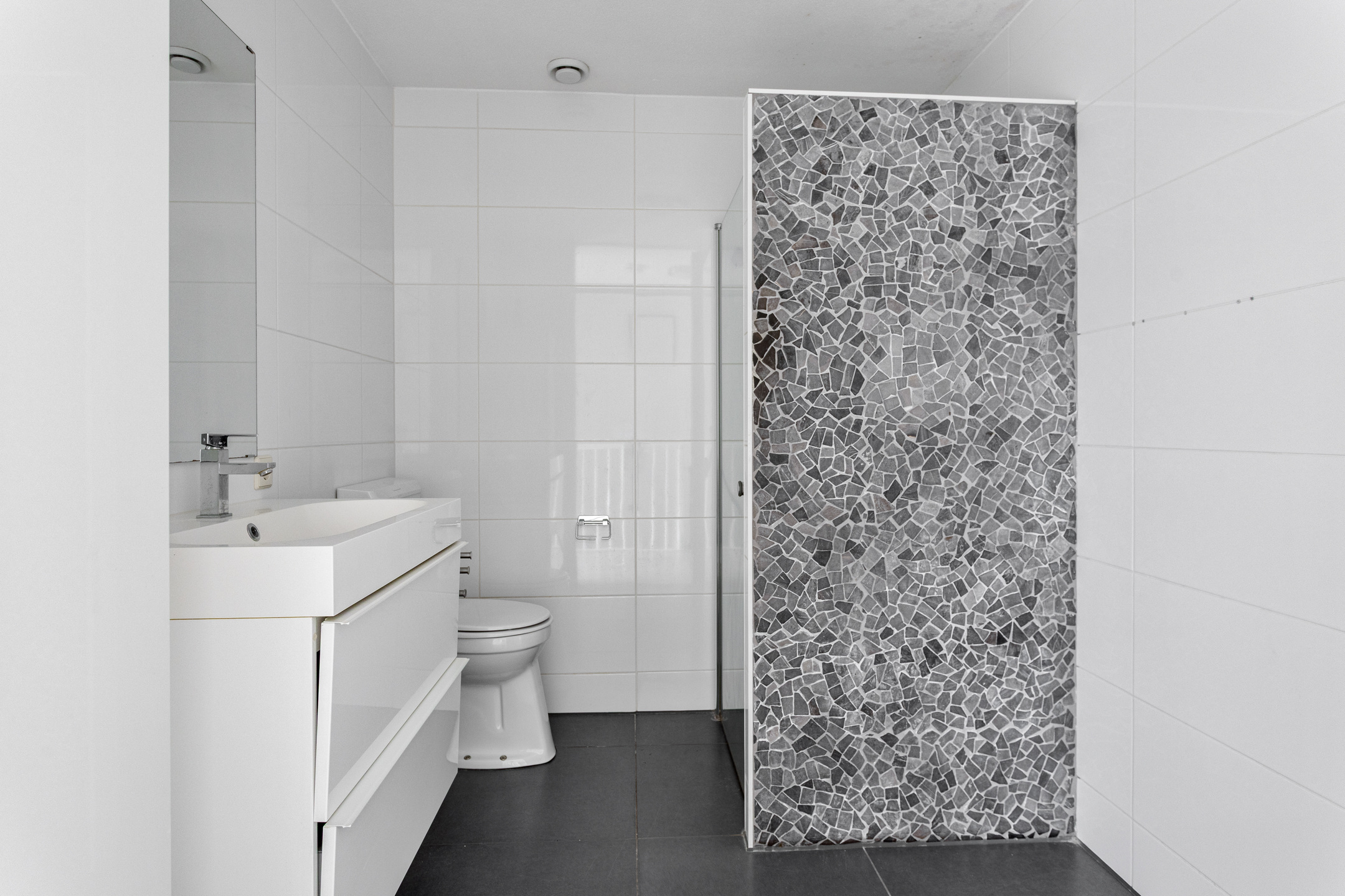 De badkamer is ruim en ingericht met een toilet, inloopdouche en modern wastafelmeubel.