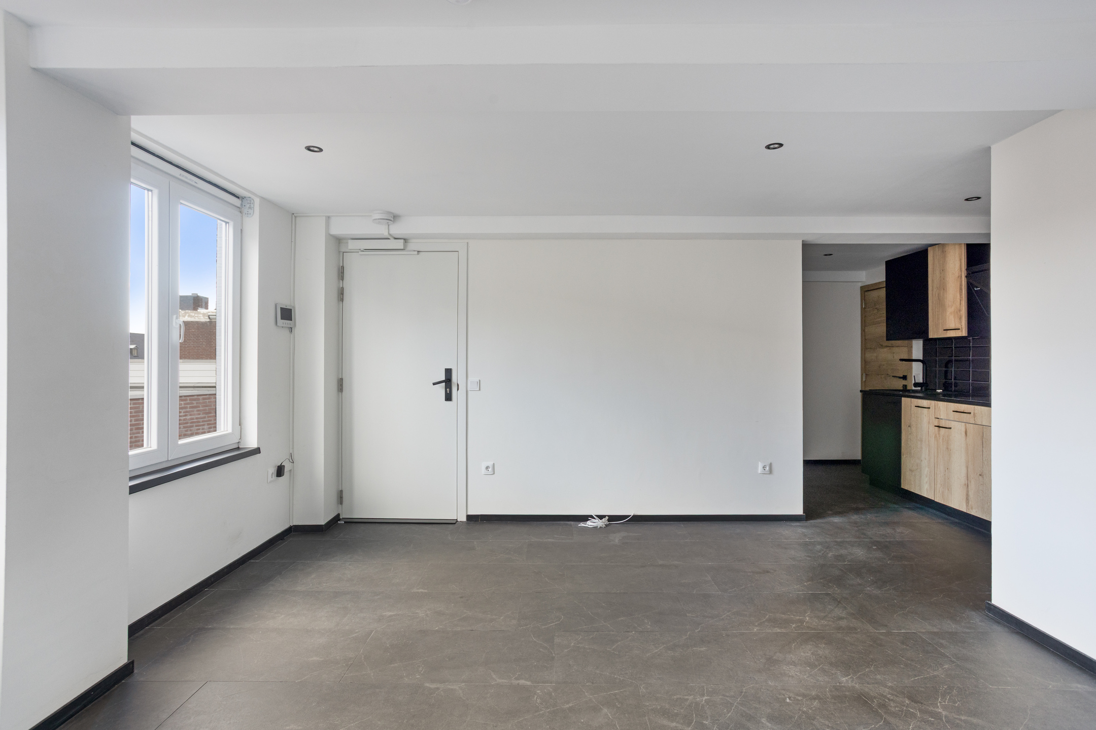You step directly into the living room. The living room is bright and spacious, featuring recessed ceiling lights, large windows, and a sleek finish. The modern tile-look laminate flooring extends throughout the entire apartment, creating a clean and uniform appearance. The air conditioning unit in the living room fully heats or cools the home.