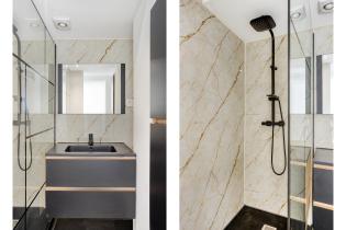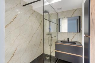 The new bathroom has a luxurious feel, featuring marble-look wall tiles, a walk-in shower with black rain shower head, recessed lighting, and a modern washbasin with cabinet and mirrored cupboard.