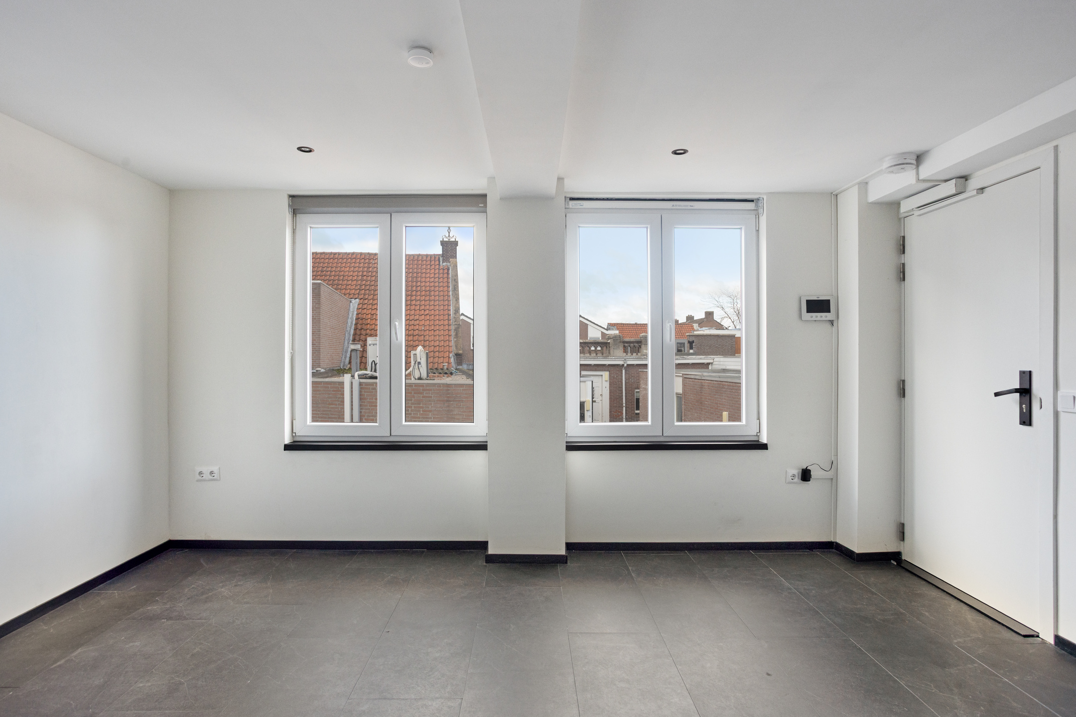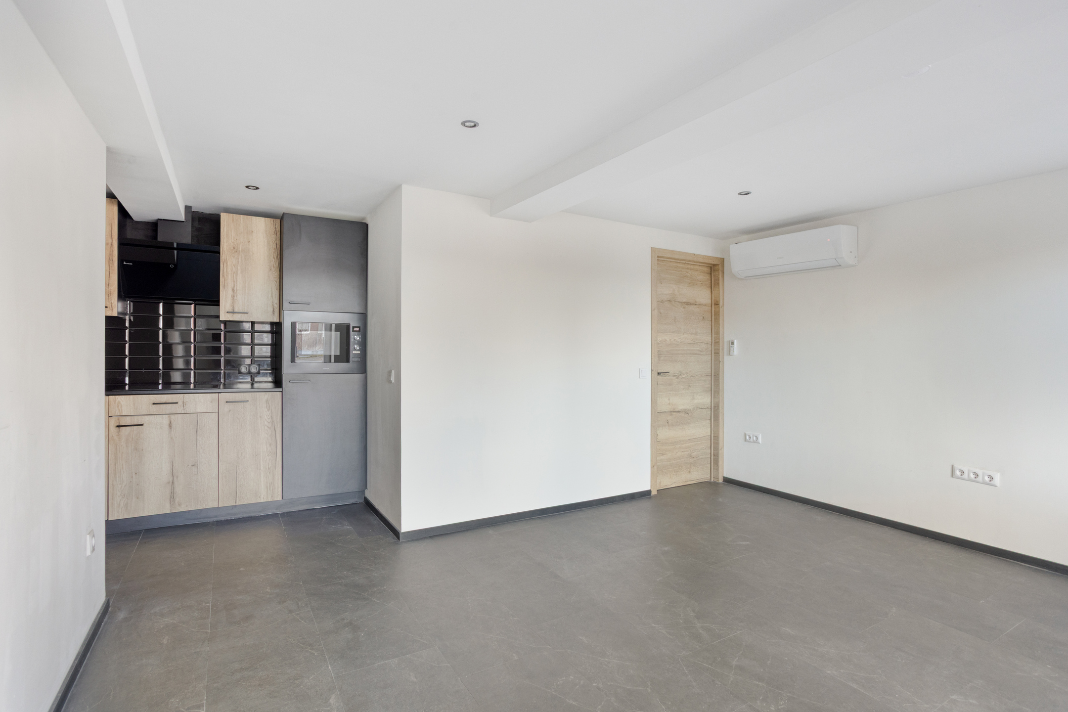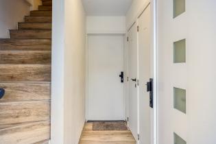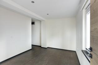 Je komt de woning binnen in de woonkamer. De woonkamer is licht en ruim voorzien van inbouwspots, grote ramen en een strakke afwerking. De moderne tegellook laminaatvloer loopt door in de gehele woning en zorgt voor een strakke, uniforme uitstraling. In de woonkamer bevindt zich ook de airco die de woning volledig verwarmd of koelt.