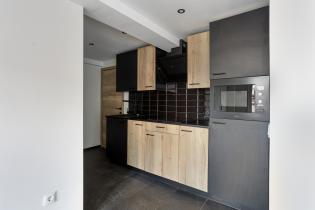 De open keuken heeft een moderne look & feel, uitgevoerd in hout en matzwart. De keuken is onder andere voorzien van een inductiekookplaat, moderne afzuigkap, combimagnetron, koelkast, zwarte spoelbak en kraan en voldoende opbergruimte. Via de keuken heb je direct toegang tot de berging en het toilet.