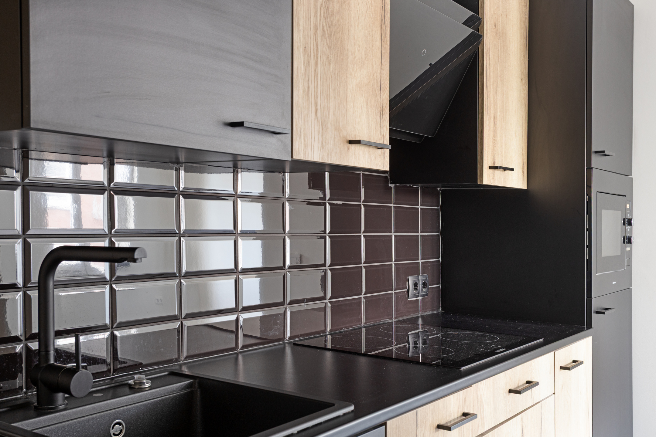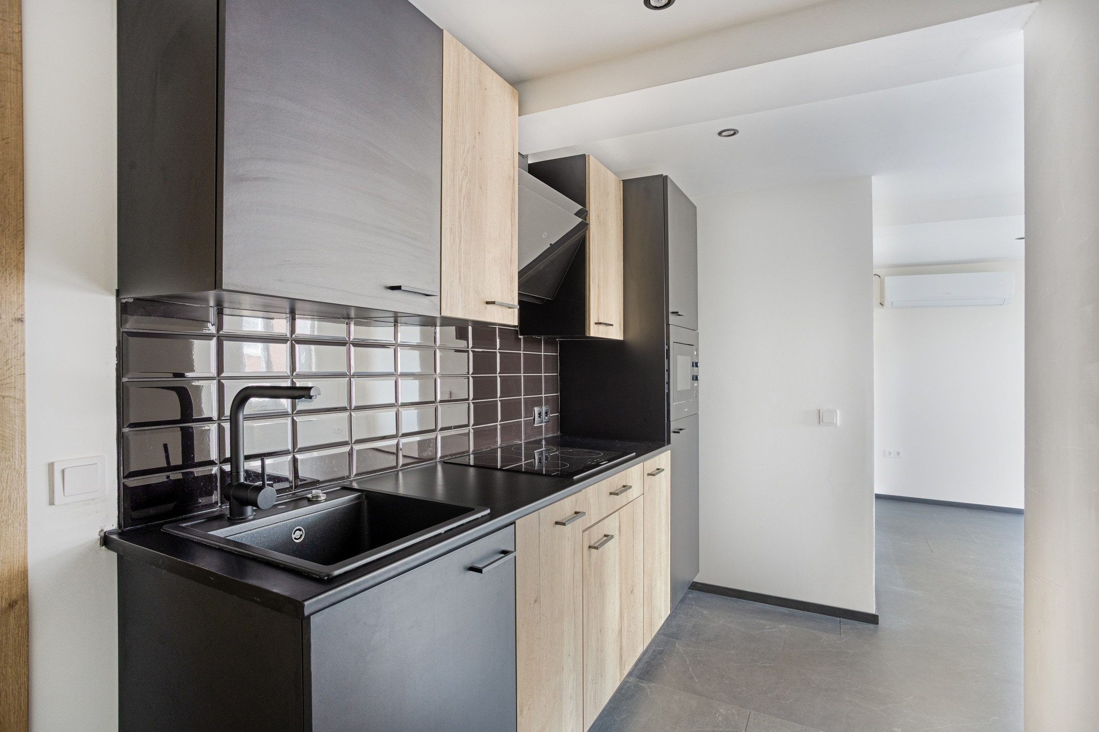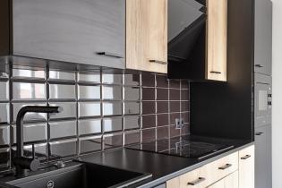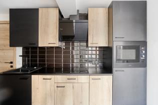 The open kitchen has a modern look and feel, finished in wood and matte black. It includes an induction cooktop, modern extractor hood, combination microwave oven, refrigerator, black sink and faucet, and ample storage space. From the kitchen, you have direct access to the storage room and toilet.