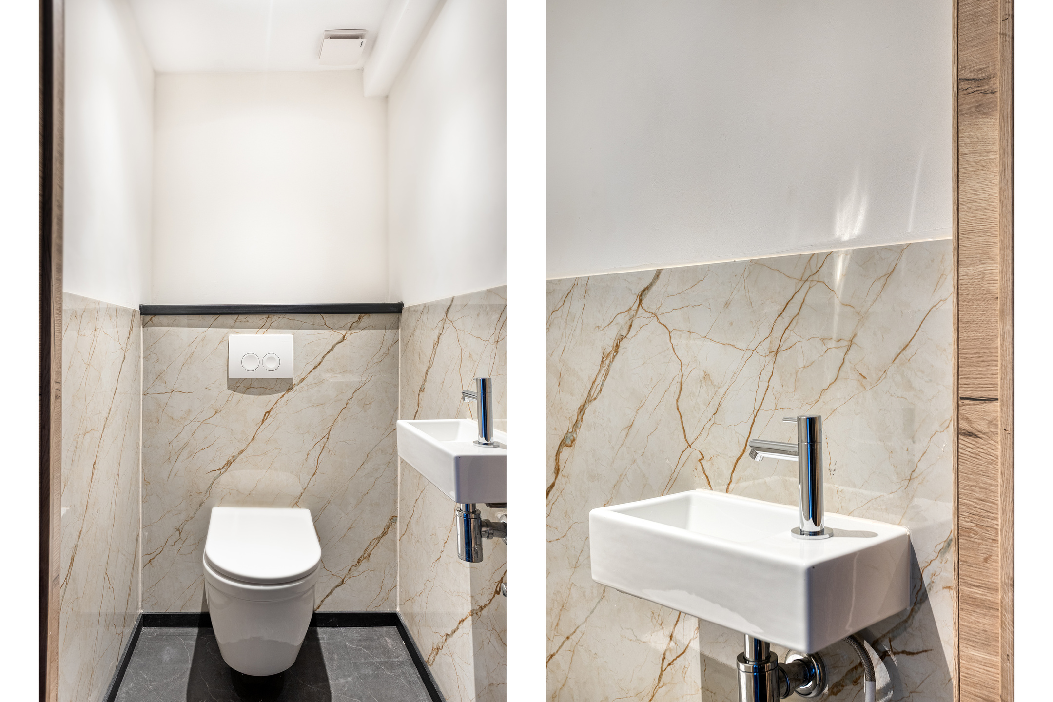 De aparte toiletruimte is half betegeld met een luxe marmeren look en is voorzien van een zwevend closet en een fonteintje.