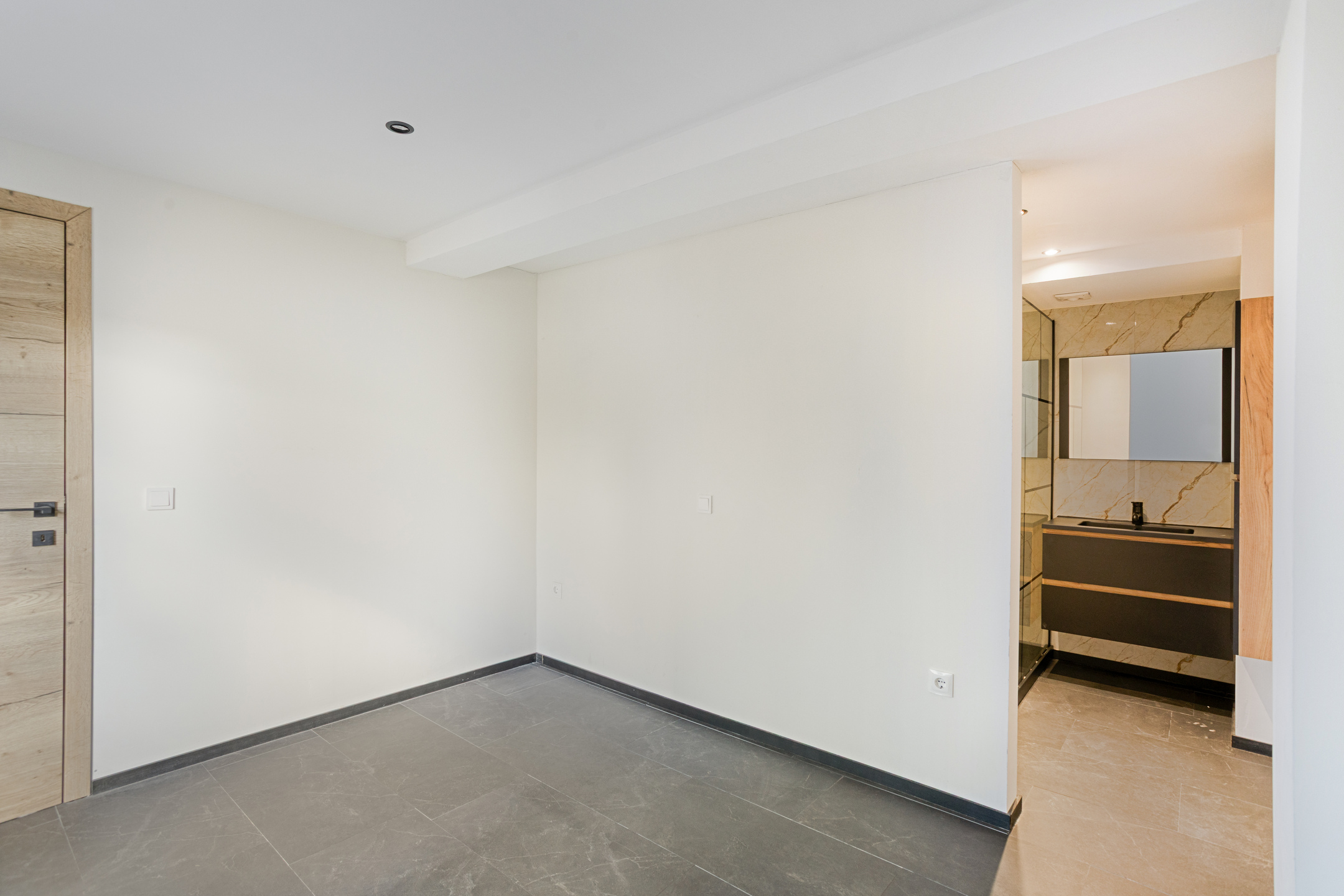 From the living room, you access the bedroom. This spacious bedroom (approx. 10m²) also has tile-look laminate flooring, recessed lighting, and PVC window frames with HR++ glazing. The bedroom also offers direct access to the bathroom.
