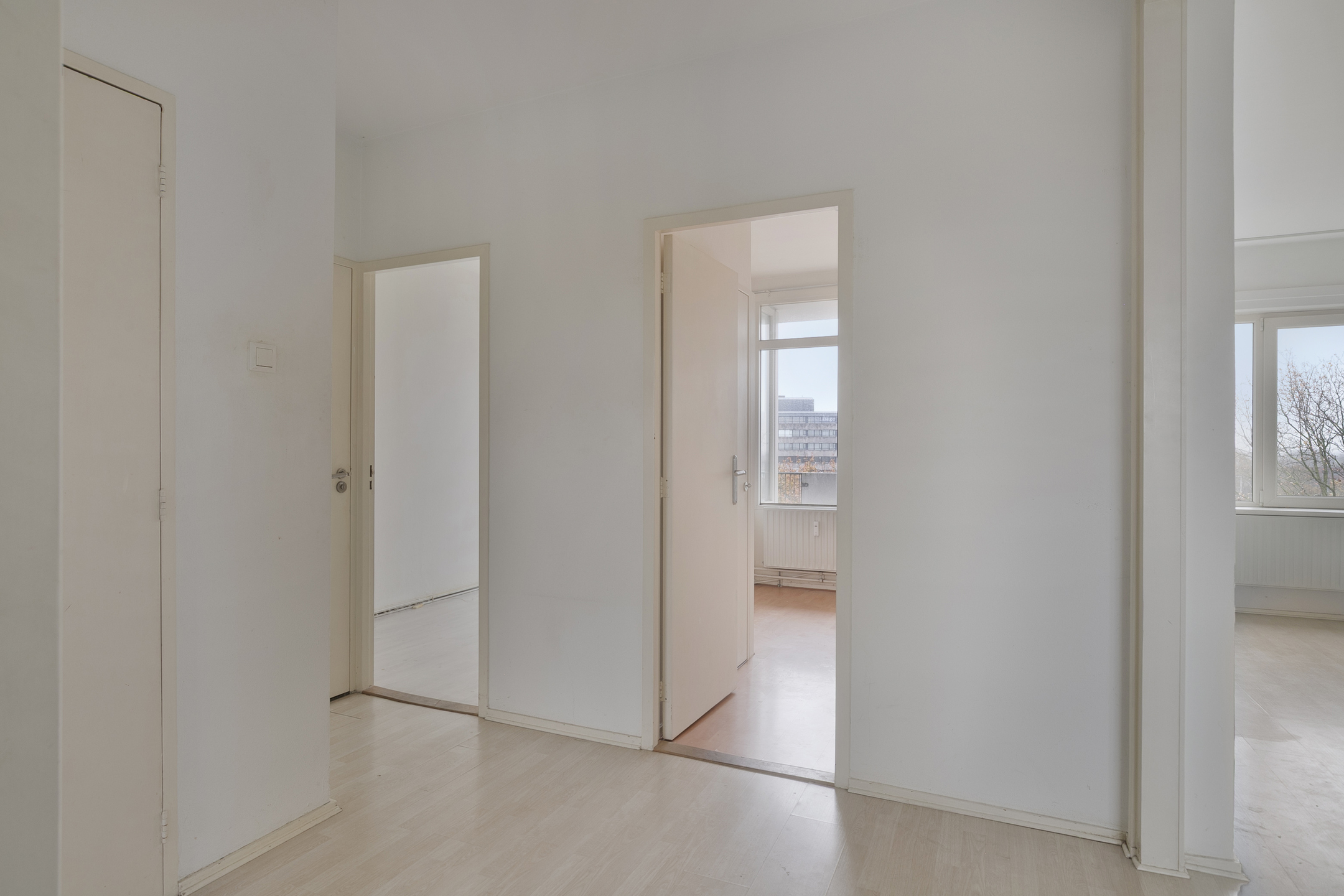 Het appartement is bereikbaar via de buitengalerij op de 6e etage en beschikt over twee slaapkamers, die eventueel samengevoegd kunnen worden. Verder is er een ruime, afsluitbare keuken, een volledig betegelde doucheruimte, een separaat toilet, een royale woonkamer (ca. 33 m²) en een balkon.