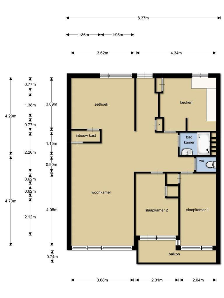 Het zitgedeelte van de woonkamer kan eenvoudig worden omgevormd tot een extra slaapkamer; oorspronkelijk was dit ook zo ingedeeld. Vrijwel het gehele appartement is voorzien van een laminaatvloer. In zowel de woonkamer als beide slaapkamers is een inbouwkast aanwezig. Via de tweede slaapkamer heeft u toegang tot het balkon, vanwaar u uitzicht heeft over de omgeving, de Ringbaan en Westpoint.