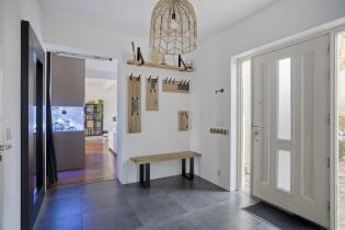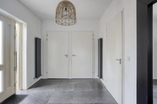 Je betreedt de woning via de ruime uitbouw aan de voorzijde. Deze aangebouwde entree met tegelvloer zorgt voor een prettige, royale hal met direct toegang tot het toilet, de meterkast, berging en de doorgang naar zowel de woonkamer als de garage.