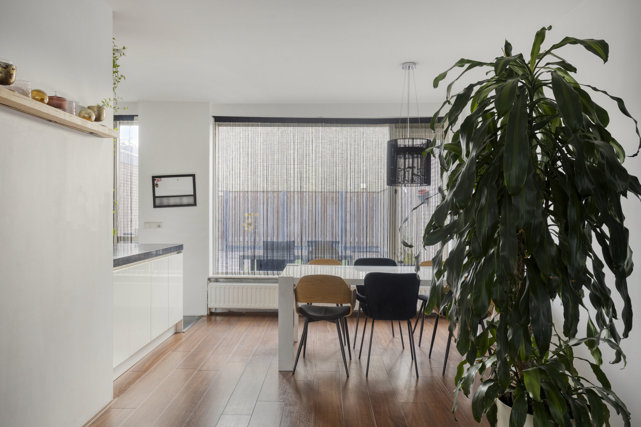 Via de ruime hal kom je binnen in de lichte L-vormige woonkamer, voorzien van een eethoek, laminaatvloer, een airco en grote raampartijen met een fijn uitzicht op de achtertuin.